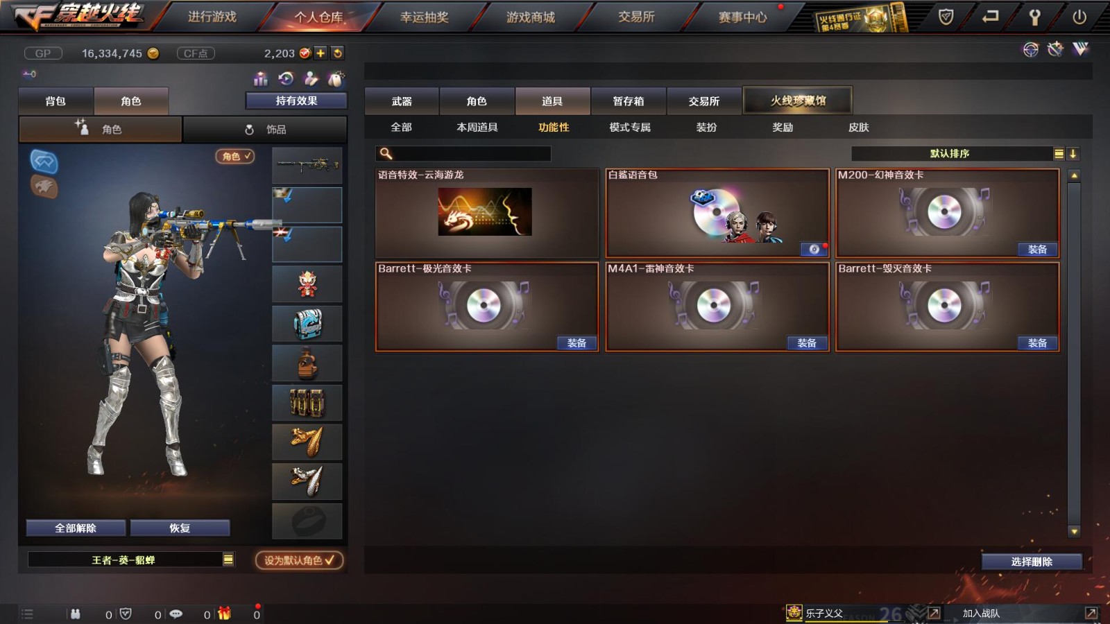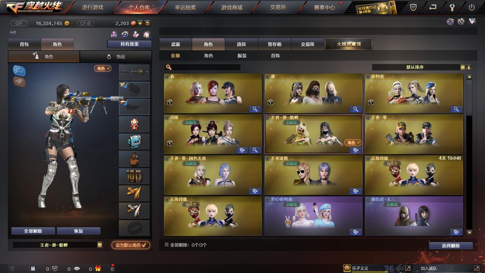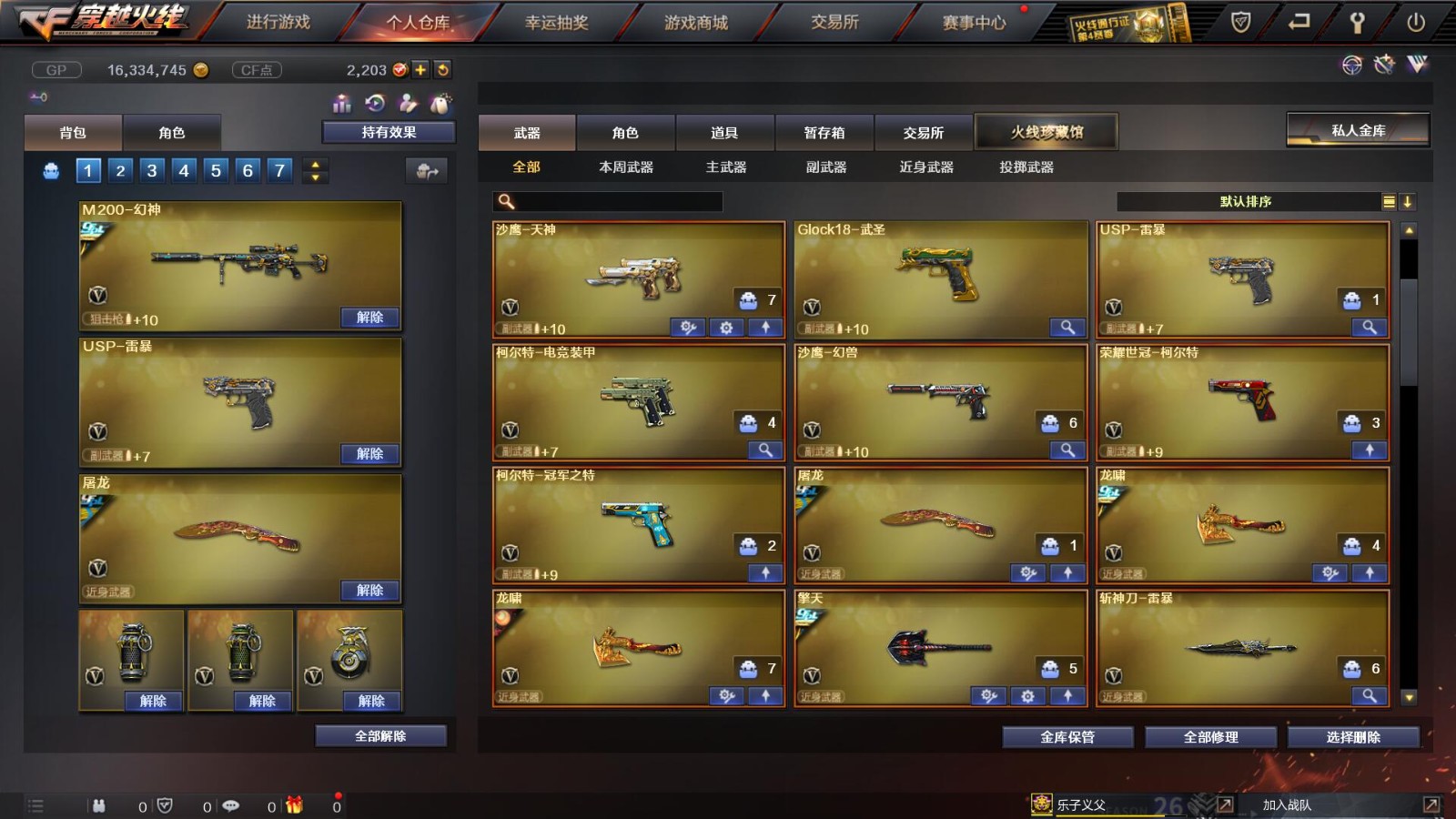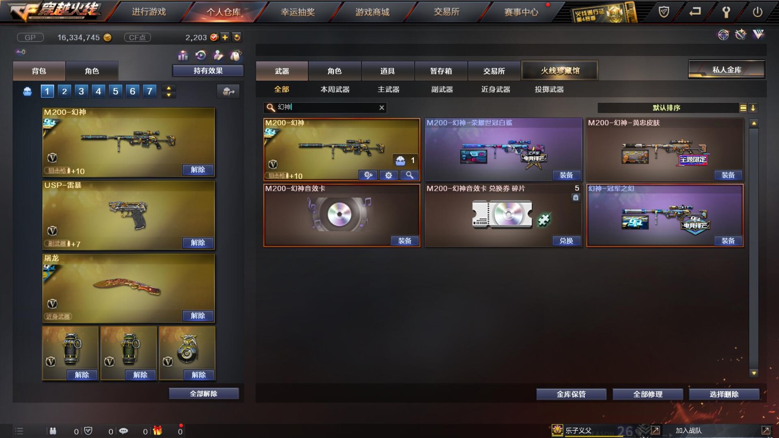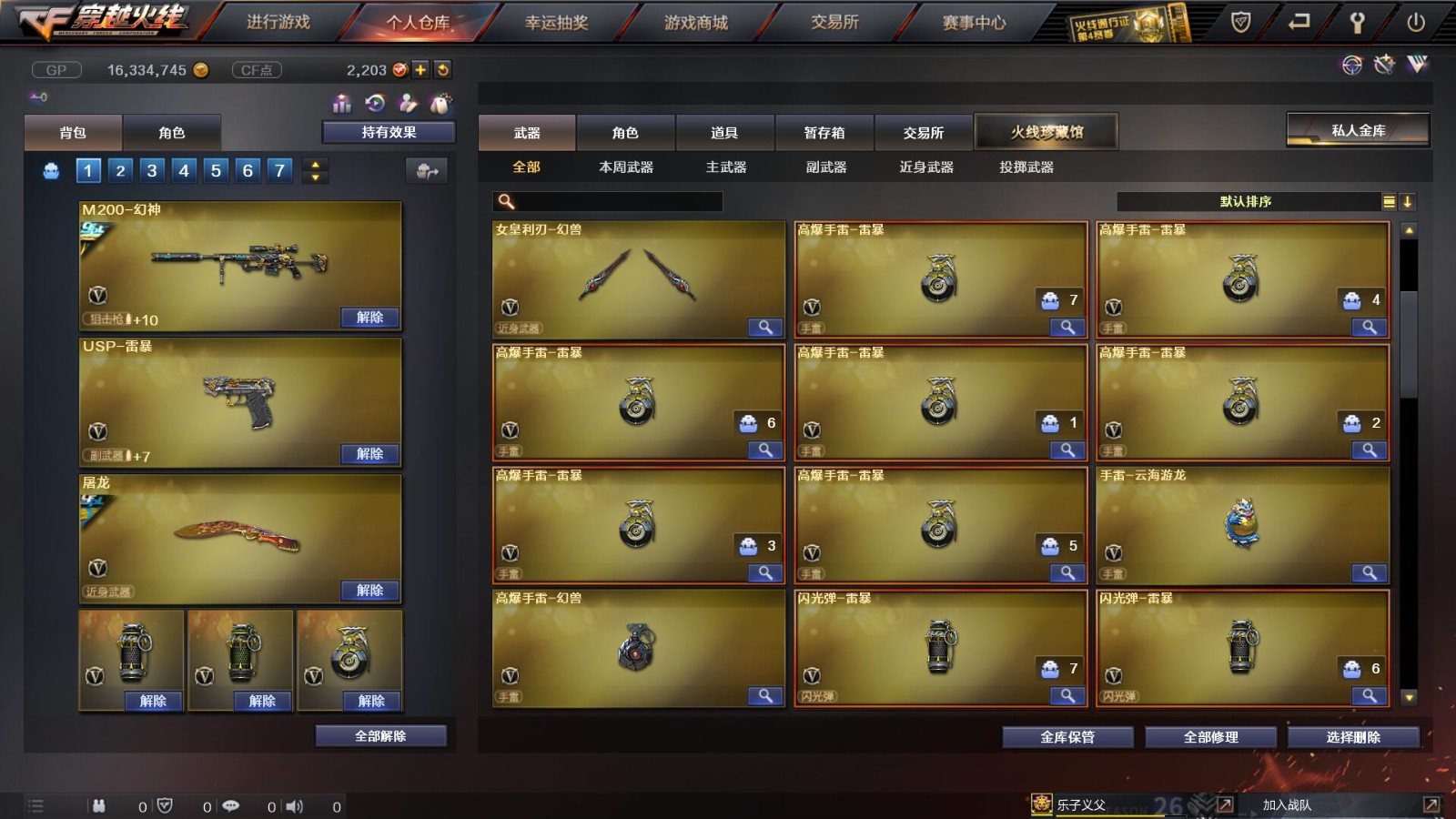 2传说/10王者/3炫金/73英雄/【重要角色10】王者凌霄/王者葵貂蝉/王者零/王者零国色天香/审判者/春/职业选手/葵(普通)/铁骑荣耀/司雨【套装2】雷暴/武圣/【传说武器2】传说辉光/传说圣灵【王者武器6】王者冰魄-觉醒版/超新星-悦享-觉醒版/王者之圣-觉醒版/王者蔷薇-觉醒版/王者雷怒/王者之决-觉醒版【炫金武器3】炫金雷神/炫金毁灭/炫金天龙【热门武器16】传说辉光/M200-幻神/Kar98K-星神/柯尔特-冠军之特/炼狱-迷你小钢/斯泰尔-蝴蝶/死亡之眼*2/荣耀世冠-柯尔特/Knife-冠军之刃/USP-雷暴/盘龙/2修罗/炼狱/金刚伞-电玩红兔【英雄武器69】AK47-火麒麟*3/M4A1-千变/AK-47-猩红传说*2/白虎-电玩蓝兔/M4A1-死神*2/M4A1-雷神/AK47-雷暴*2/AK47-机械迷城/M4A1-武圣/M4A1-黑龙/M4A1-猎神/AWM-天龙/Barrett-暗月传说*3/Barrett-极光/barrett-金色蔷薇*2/Barrett-毁灭/M200-幻神/Kar98K-星神/加特林-炼狱/RPK-盘龙/龙啸*2/女皇利刃-幻兽/斩神刀-雷暴/屠龙/擎天/AA-12-雷霆/闪光弹-雷暴*7/烟雾弹-雷暴*7/高爆手雷-雷暴*7/高爆手雷-幻兽/烟雾弹-幻兽/闪光弹-幻兽/手雷-云海游龙/沙鹰-修罗*2/沙鹰-天神/USP-雷暴/柯尔特-电竞装甲/沙鹰-幻兽/柯尔特-冠军之特/Glock18-武圣/荣耀世冠-柯尔特【热门皮肤武器17】龙啸-纸灯龙/M200-幻神-黄忠/M200-幻神-荣耀世冠白鲨/幻神-冠军之幻/毁灭-BEAN-2020MVP/毁灭-冠军之怒/巴雷特-毁灭-CFPL冠军/龙啸-冠军之啸/擎天-冠军之击/天龙-CFSTAR/火麒麟-CFSTAR/修罗-CFSTAR/毁灭耀金/屠龙-荣耀之锋/雷神-荣耀之魄/炼狱-星空/天龙-秘银【人偶武器武器4】斯泰尔-蝴蝶/炼狱-迷你小钢/火麒麟-灵狐/COP-旗袍【暴走生化武器6】斯泰尔-蝴蝶/炼狱-迷你小钢/死亡之眼*2/RPK-盘龙/双面神【挑战武器武器4】神圣爆裂者III/神圣爆裂者-末日III/征服者-超越觉醒 [Lv 3]/阐释者III【音效卡武器5】Barrett-极光音效卡/M200-幻神音效卡/白鲨语音包/M4A1-雷神音效卡/Barrett-毁灭音效卡【普通皮肤7】火麒麟-AG/AK47-B-常胜将军-孙权/修罗-能量核心*2/天启-暗月/毁灭-暗月/极光-能量核心