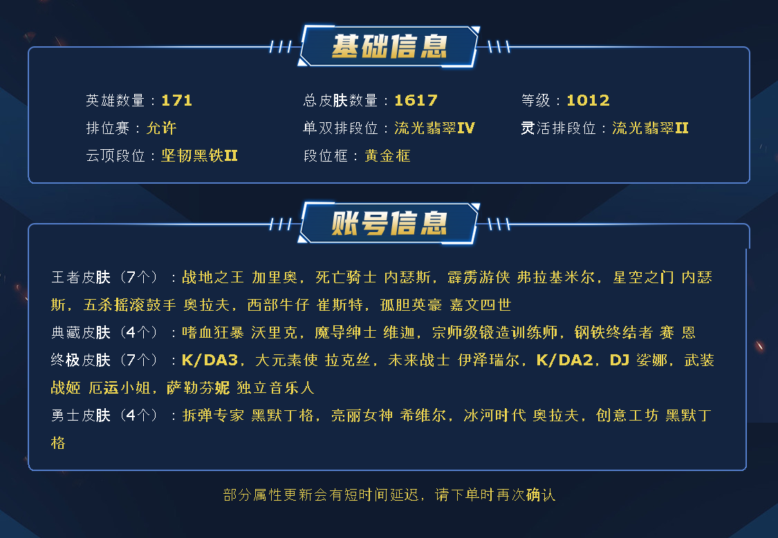 ~~喜欢记得收藏~~可排位~~1453皮全英雄丨50神话/至臻/海克斯丨龙瞎/龙的传人丨神龙尊者套丨灵魂莲华套丨幻灵套丨KDA套丨青花瓷套丨斩星剑圣丨猫狗大战套丨水晶玫瑰套丨泳池女警丨觅心悠米丨哨兵薇恩丨女帝卡特丨银龙裁决丨嫦娥皎月丨替父从军丨律动格温丨羊年金克斯丨鼠年德莱文丨北极星皎月丨西部天使艾希丨安妮梦游仙境丨电玩瑞雯人马丨EDG佐伊男枪丨幽梦玫瑰辛德拉丨玉剑男刀剑姬剑圣丨星守狐狸卡莎风女丨至高天奎桑提薇古丝~~租之前尽量查一下游戏ID,确保段位是您需要的,避免浪费您的时间~~请勿挂机逃跑故意送人头,谢谢合作,谢谢~~