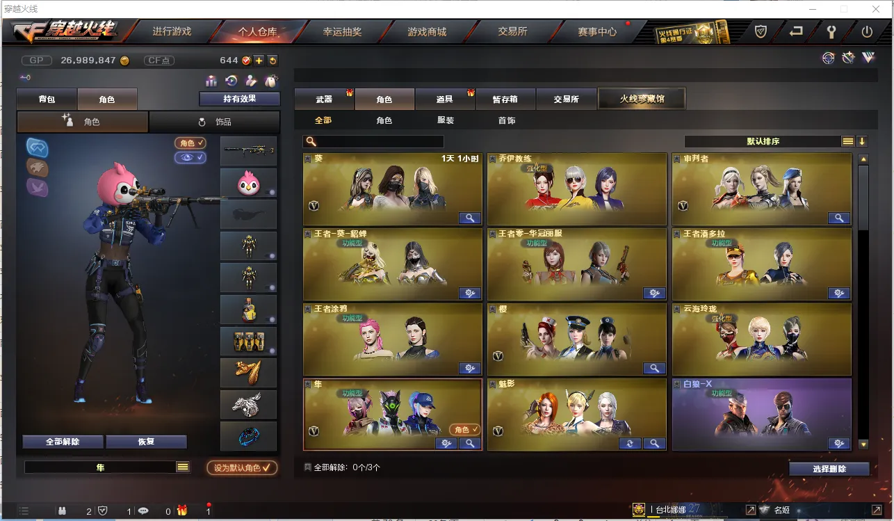 【角 色】:CFVIP6、乔伊教练、审判者、王者葵貂蝉(爆破四防)、王者零华冠丽服、王者潘多拉、王者涂鸦(佣兵觉醒无需换弹、捕食者之眼)、樱、云海玲珑、隼、魅影、双蛇戒指、双龙戒指、锋芒之环
