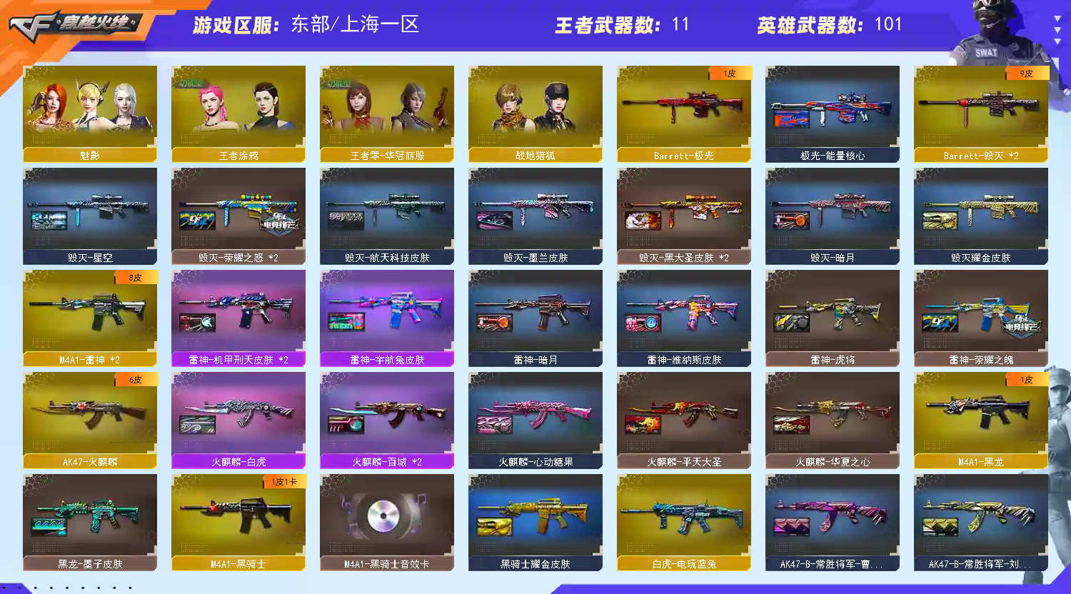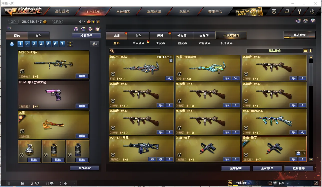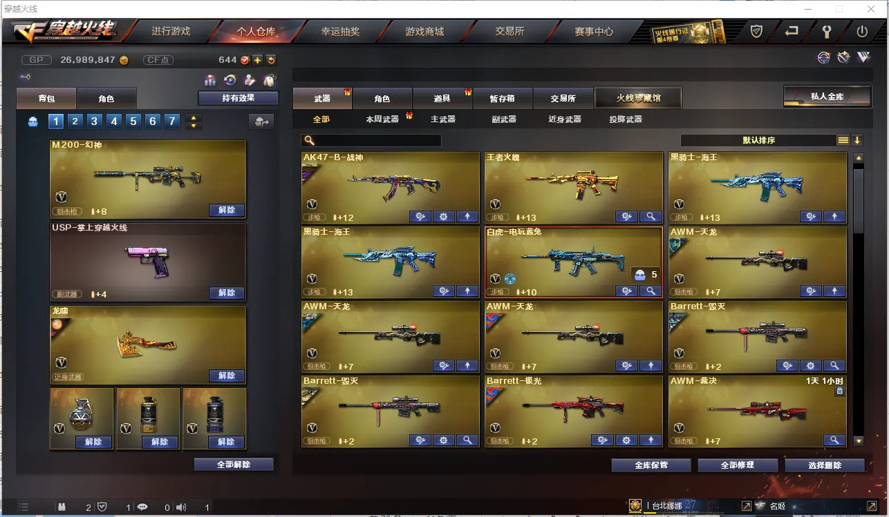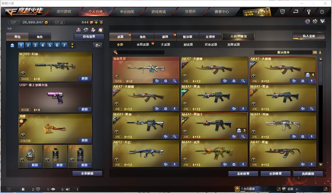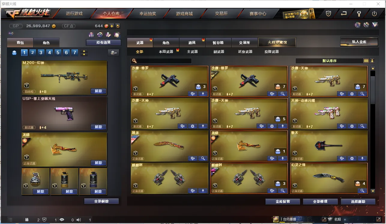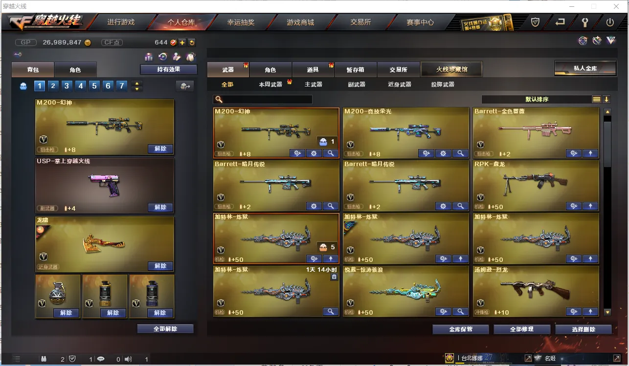 【主 武】:M200幻神、传说圣灵、烈龙X6、异变清道夫、斯太尔蝴蝶、M200竞技荣光、王者之翼、王者火魄、王者之势、炫金雷神、炫金骑士、炫金天龙、火麒麟(CFSTAR、华夏之心、白虎、AG战队)、黑龙、雷神、黑骑士(白马银枪、黑骑士音效卡)、死神、天启、武圣、黑鲨、龙血、青龙、无影神兵利器、烈火动感闪耀、玫瑰精灵、QBZ金色蔷薇、烈火、战神、黑骑士海王、白虎电玩蓝兔、天龙(CFSTAR、传奇白鲨)、毁灭、极光、Barrett金色蔷薇、Barrett暗月传说、盘龙、炼狱X3、AA12雷霆、金魔等各种活动武器