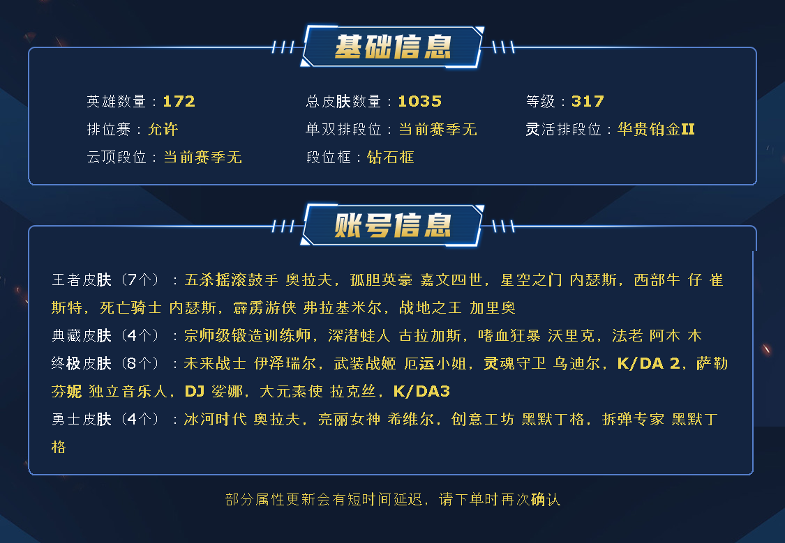 联盟一区千皮号|至臻黑夜使者凯隐|幻灵战斗猫金克斯|龙刀|至臻ez|至臻·青花瓷·拉克丝|至臻·青花瓷·丽桑卓|至臻·神龙尊者·沃利贝尔|至臻·神龙尊者·瑟提|至臻·焰执事·布兰德|至臻·源计划·劫|至臻·真实伤害·亚索|至臻·征服者·贾克斯|至臻·kda·卡莎|大元素使拉克丝|未来战士ez|武装战姬·厄运小姐|DJ娑娜|kda萨勒芬妮|海克斯·牛头|海克斯·大头|海克斯·安妮|海克斯·阿木木|海克斯·卡萨丁|海克斯·鳄鱼|海克斯人马|摄魂使者·薇恩|等皮肤,喜欢的老板可以收藏一下,方便下次租用,谢谢!超低价!!!