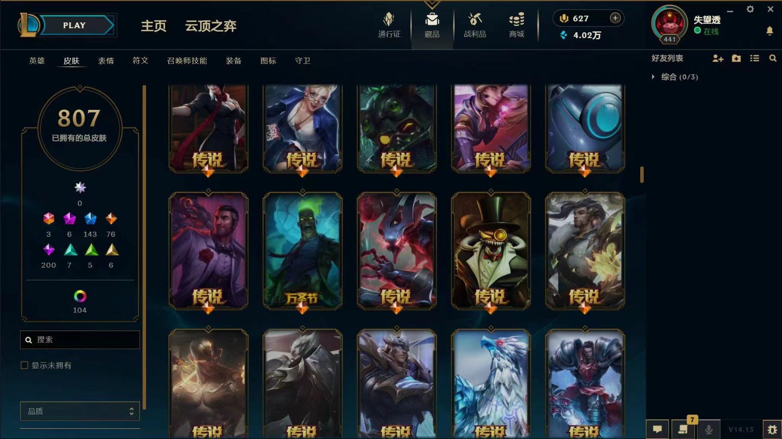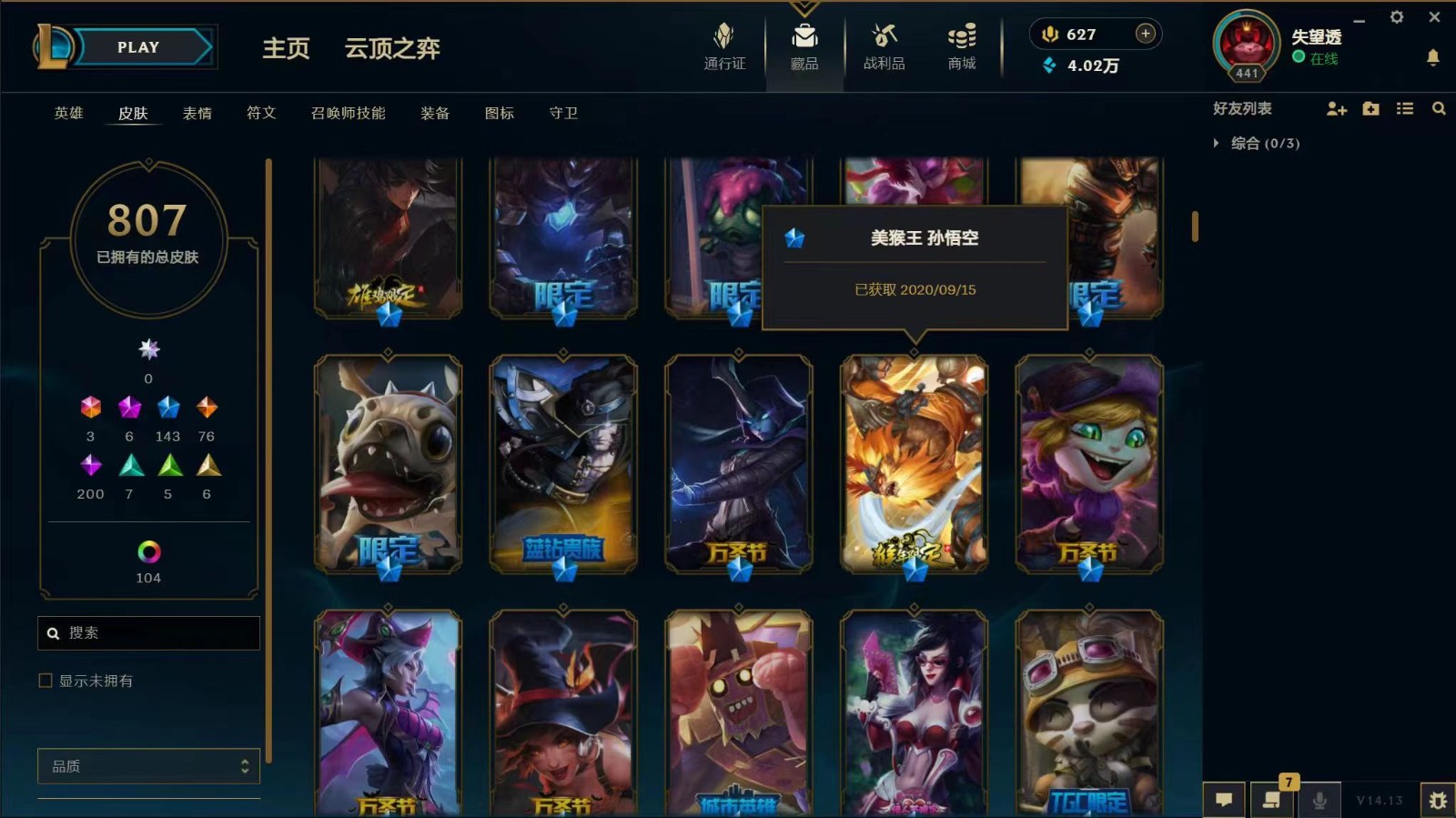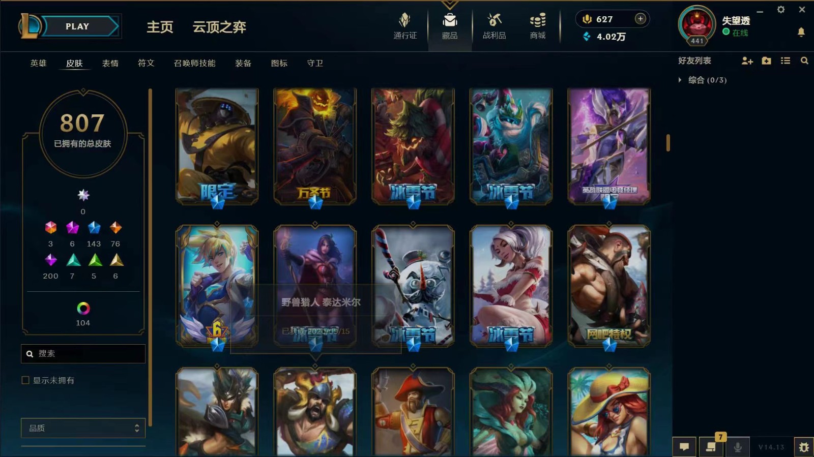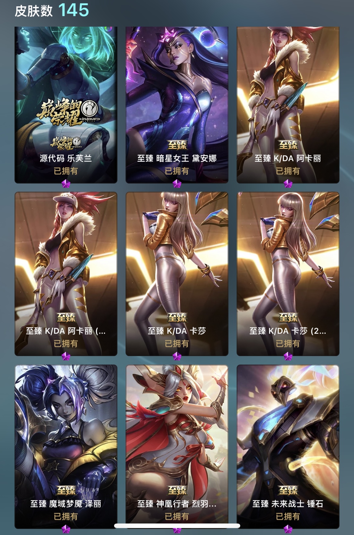 比尔吉沃特1201皮 至臻黛安娜 泽丽 霞等 龙猴狗年拉克丝等 斩星*穿星魔锋御星之矢 云顶有小小大龙可排位