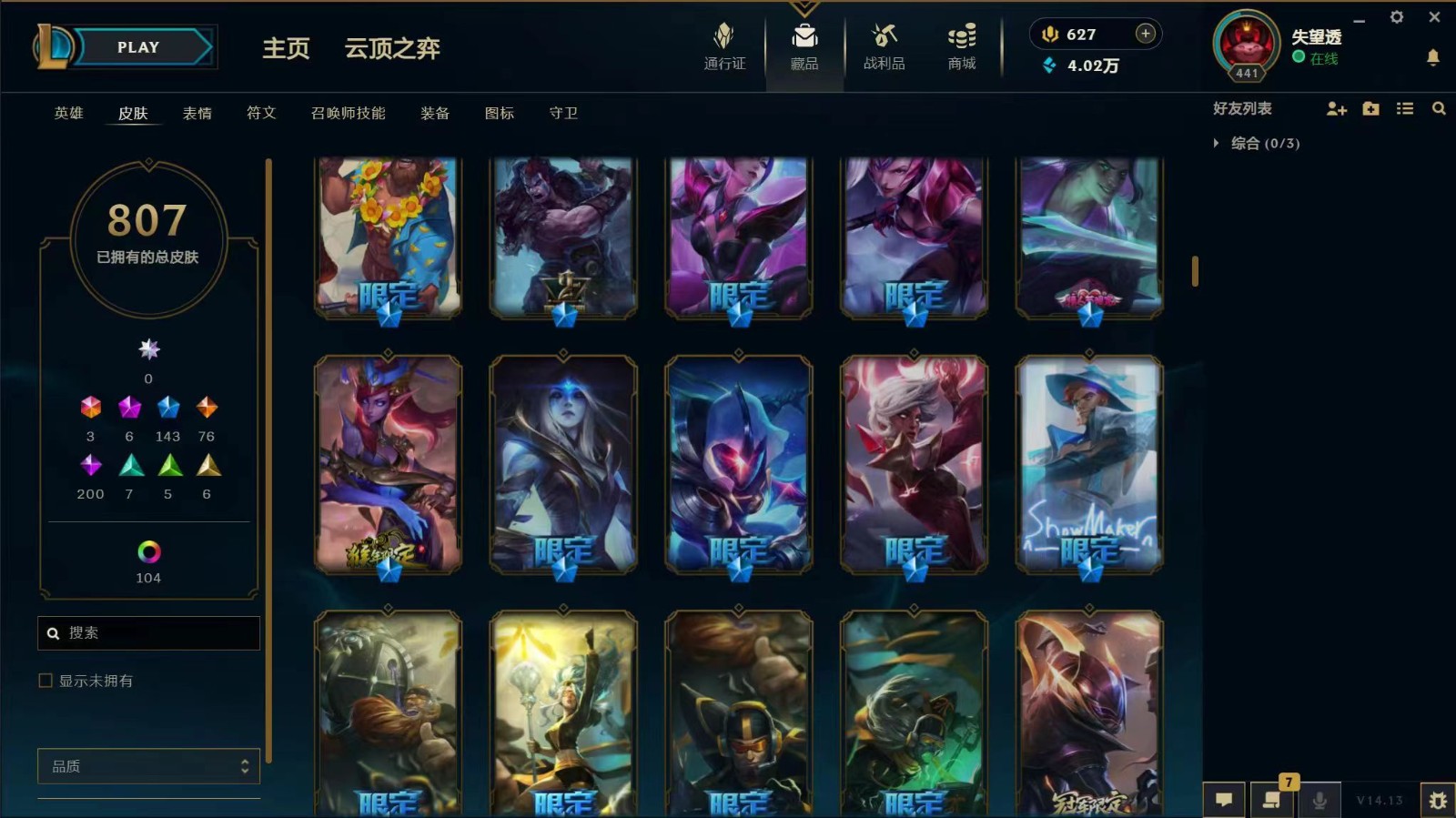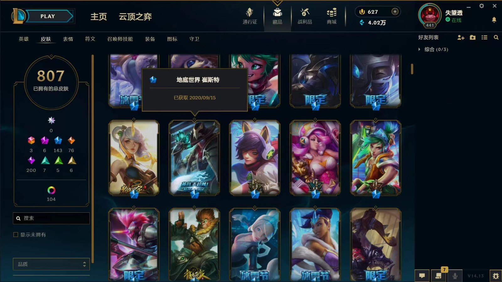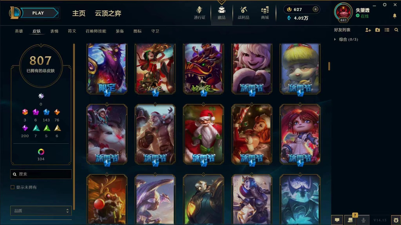 比尔吉沃特1201皮 至臻黛安娜 泽丽 霞等 龙猴狗年拉克丝等 斩星*穿星魔锋御星之矢 云顶有小小大龙可排位