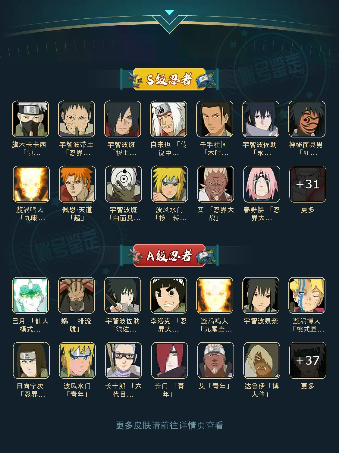 VIP11级;S忍41个;A忍42个,通灵兽20个,S忍:猿飞日斩大蛇丸普通纲手九喇嘛鸣人永恒万花筒佐助忍战樱仙人自来也百豪纲手普通自来也豪杰自来也死门凯波风水门秽土水门秽土猿飞千手扉间秽土扉间千手柱间秽土柱间木叶创立柱...