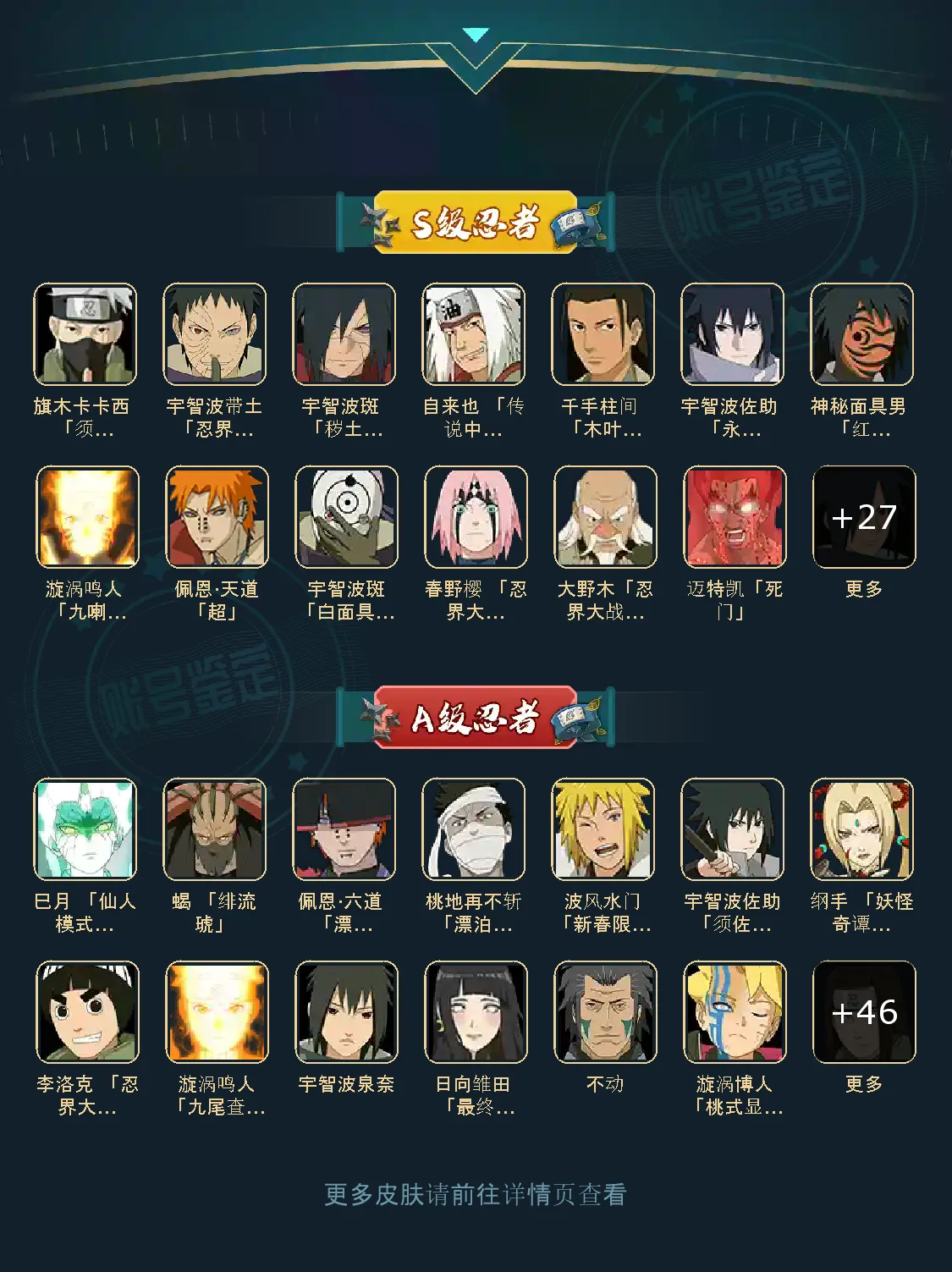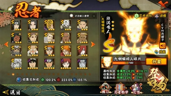 S忍36个;A忍50个,通灵兽23个,S忍:大蛇丸波风水门宇智波斑九喇嘛鸣人永恒万花筒佐助忍战樱仙人自来也普通纲手普通自来也豪杰自来也死门凯猿飞日斩秽土猿飞千手扉间千手柱间木叶创立柱间秽土柱间秽土斑木叶创立