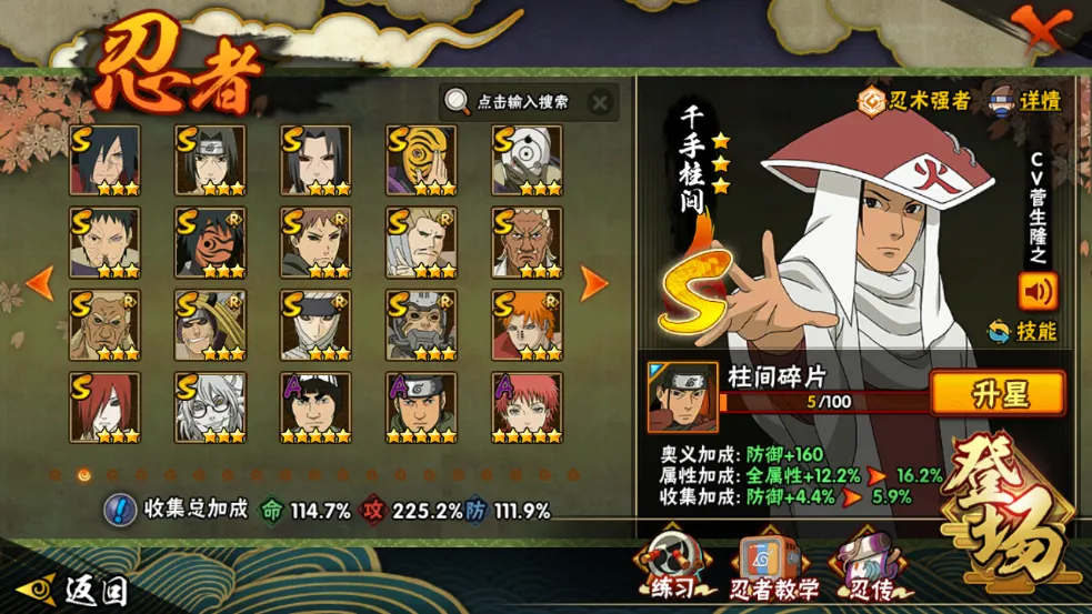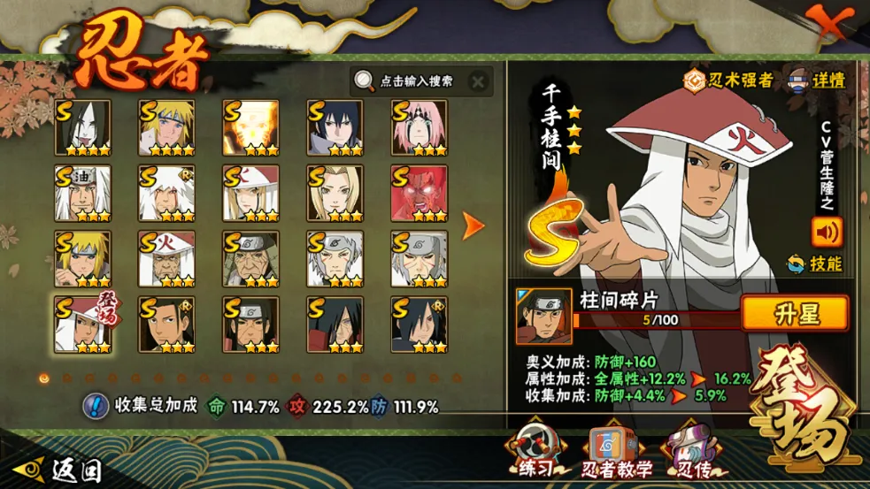 战力:1452W+;S忍37个;A忍48个,通灵兽21个,S忍:大蛇丸波风水门九喇嘛鸣人永恒万花筒佐助忍战樱普通纲手百豪纲手死门凯普通自来也豪杰自来也秽土水门猿飞日斩秽土猿飞千手扉间秽土扉间千手柱间秽土柱间木叶创立柱间秽土斑木叶创立斑秽土解