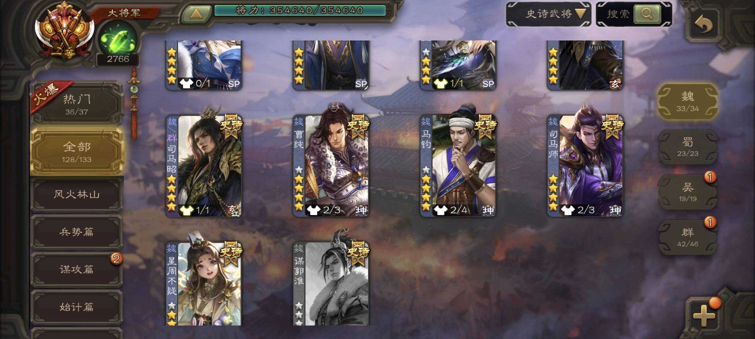 魏——郝昭,谋曹操,谋曹仁,王粲,王凌,文鸯,张昌蒲,界于禁,界钟会,界曹真,熙康,程昱,戏志才,杨修,陈琳,王朗,刘哔,王元姬,羊徽瑜,sp司马昭,曹纯,马钧,司马师,曹婴,郭女王,星周不疑,谋曹丕,蒋干,谋夏侯惇,曹髦,势董昭