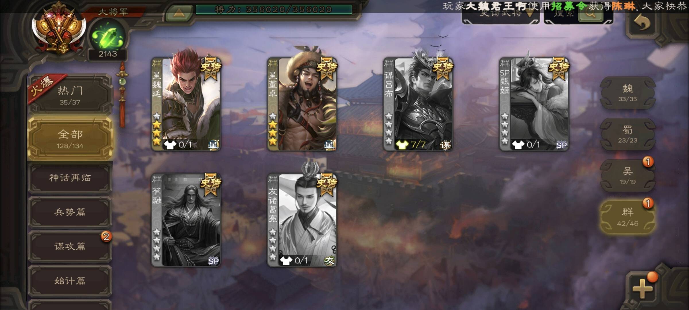 群——左慈,许攸,谋貂蝉,杜预,刘璋,界左慈,沮授,界李儒,张让,麹义,陶谦,士燮,司马徽,卑弥呼,刘焉,王允,苏飞,公孙康,兀突骨,祢衡,庞德公,郑玄,星甘宁,张仲景,黄甫嵩,界沮授,审配,徐荣,陈登,张琪瑛,灵雎,杨彪,裴秀,十常侍,星黄忠,星魏延,谋公孙瓒,势于吉