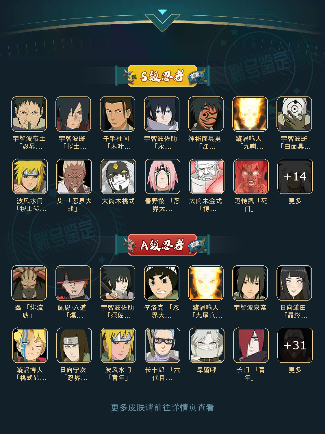 战力:1300W+;VIP11级;S忍27个;A忍37个,通灵兽19个,S忍:九喇嘛鸣人永恒万花筒佐助忍战樱豪杰自来也大蛇丸百豪纲手普通纲手死门凯波风水门秽土水门猿飞日斩秽土猿飞秽土扉间木叶创立柱间秽土解斑白面具忍战带土红夜面具男金角银角秽