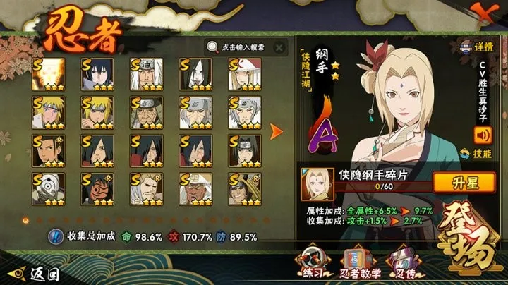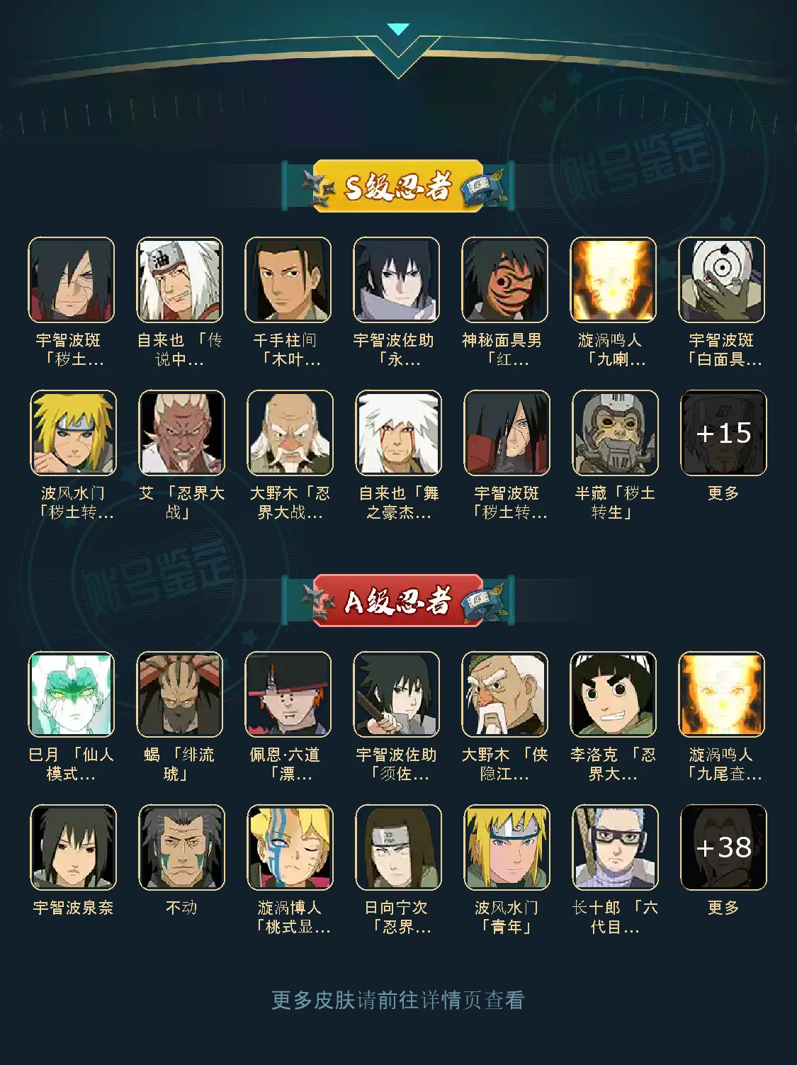 战力:1231W+;VIP13级;S忍24个;A忍41个,通灵兽22个,S忍:九喇嘛鸣人永恒万花筒佐助普通自来也大蛇丸百豪纲手波风水门秽土水门秽土猿飞秽土扉间千手扉间木叶创立柱间宇智波斑秽土斑秽土解斑须佐鼬白面具红夜面具男鬼灯幻月四代艾金角