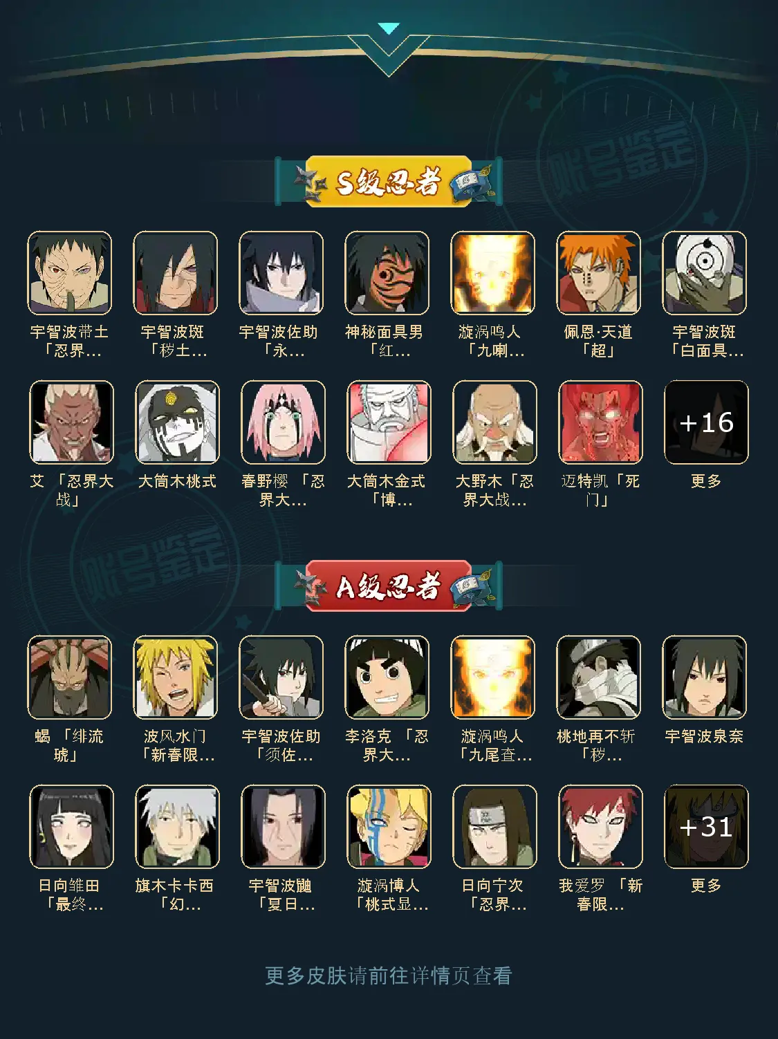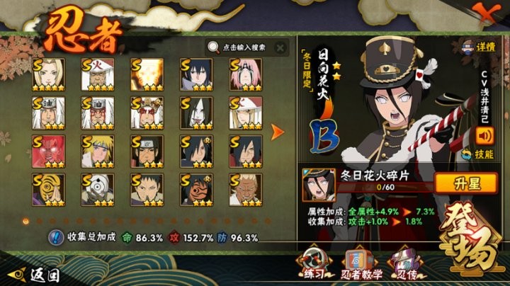 战力:1463W+;VIP12级;S忍26个;A忍35个,通灵兽20个,S忍:普通纲手猿飞日斩九喇嘛鸣人永恒万花筒佐助忍战樱仙人自来也大蛇丸百豪纲手普通自来也豪杰自来也死门凯波风水门秽土柱间木叶创立斑秽土解斑神秘面具男白面具忍战带土红夜面具