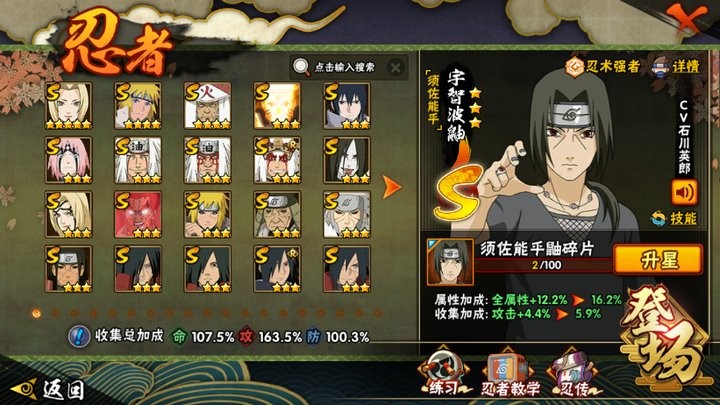 战力:1636W+;VIP9级;S忍26个;A忍34个,通灵兽21个,S忍:普通纲手波风水门猿飞日斩九喇嘛鸣人永恒万花筒佐助忍战樱仙人自来也大蛇丸普通自来也豪杰自来也百豪纲手死门凯秽土水门秽土猿飞秽土扉间秽土柱间秽土斑宇智波斑木叶创立斑秽土