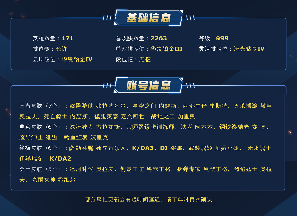 ~~喜欢记得收藏~~可排位~~2300皮全英雄丨90神话/至臻/海克斯丨龙瞎/龙的传人丨IG套丨灵魂莲华套丨福牛守护者套丨EDG套丨FPX套丨KDA套丨DWG套丨斩星剑圣丨穿星赵信丨创星璐璐丨勇敢的心丨卧虎藏龙丨舞会公主丨女帝卡特丨哨兵薇恩丨嫦娥皎月丨替父从军丨银龙裁决丨甜心格温丨青花瓷ez丨羊年金克斯丨黑夜吸血鬼丨觅心金克斯丨神凰行者霞丨甜心琴女霞丨幻灵金克斯丨西部天使艾希丨安妮梦游仙境丨至高天奎桑提丨水晶玫瑰阿克尚丨神龙尊者李青亚索丨幽梦玫瑰男刀辛德拉丨星守佐伊狐狸风女ez丨玉剑男刀女刀剑姬剑圣丨电玩女警女枪卡莎瑞文~~租之前尽量查一下游戏ID,确保段位是您需要的,避免浪费您的时间~~请勿挂机逃跑故意送人头,谢谢合作,谢谢~~