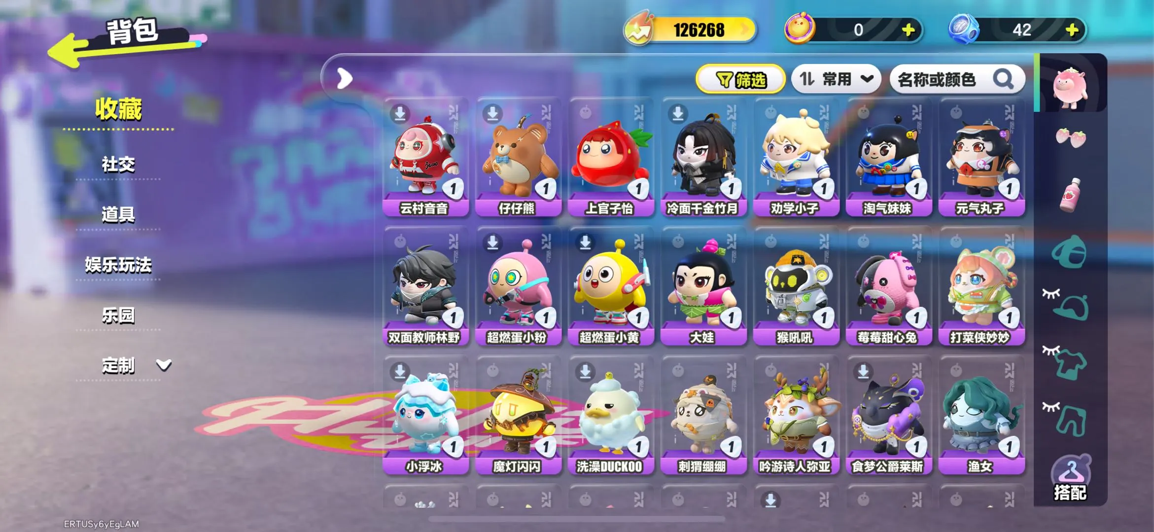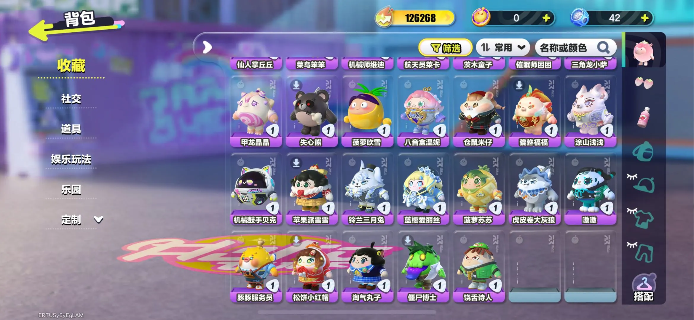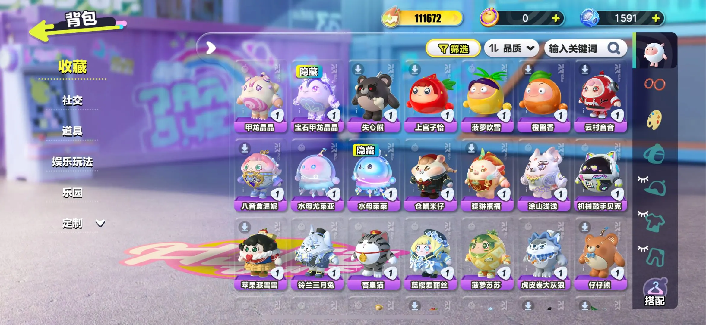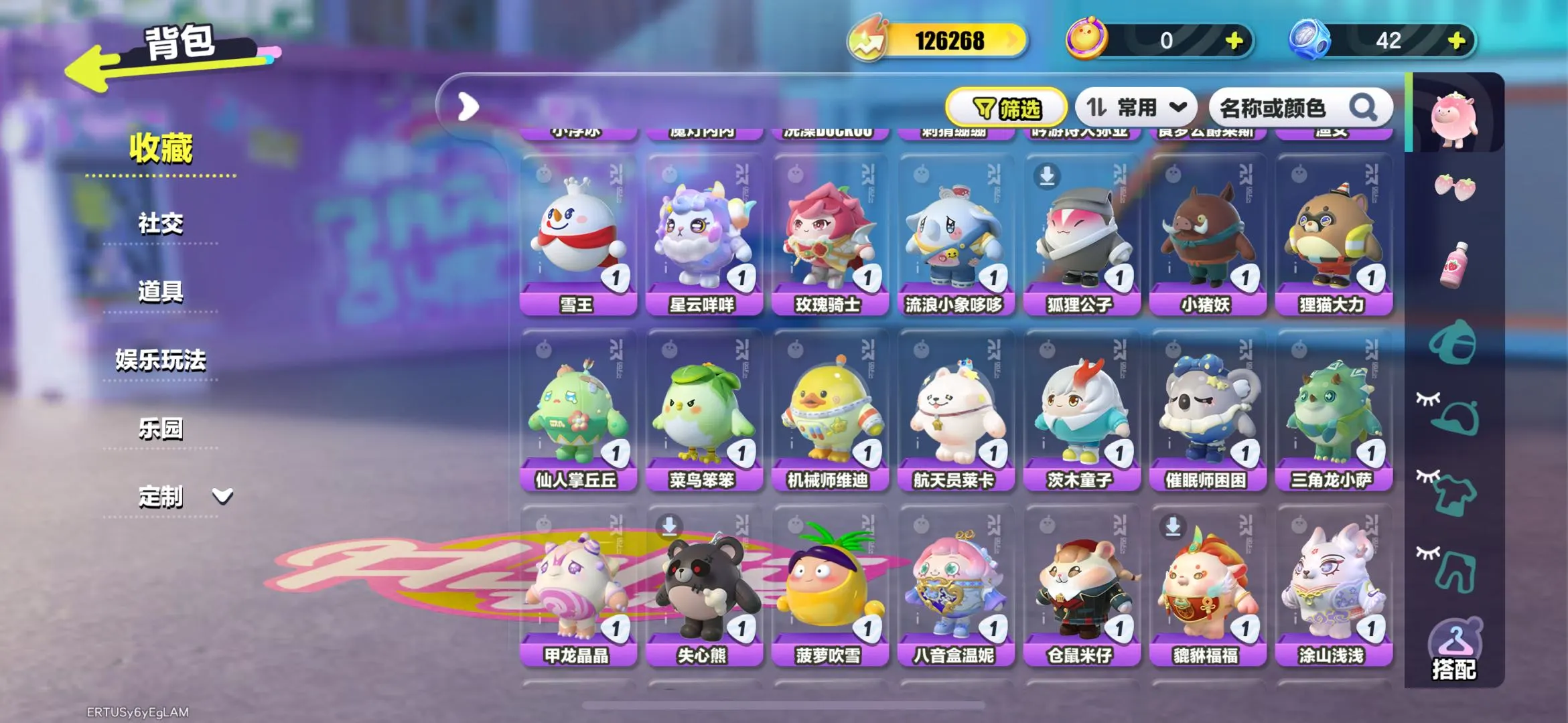 典藏:宝石甲龙晶晶 水母莱莱 云村音音 橙留香 菠萝吹雪 上官子怡 失心熊 甲龙晶晶 三角龙小萨 催眠师困困 茨木童子 航天员莱卡 机械师维迪 菜鸟笨笨 仙人掌丘丘 狸猫大力 狐狸公子 流浪小象哆哆 玫瑰骑士 星云咩咩 雪王 渔女 食梦公爵莱斯 吟游诗人弥亚 洗澡DUCKOO 魔灯闪闪 铃兰三月兔 DongDong 仔仔熊 圆圆子 饶舌诗人 海藻偷偷 淘气丸子 小猪妖 松饼小红帽 僵尸博士 豚豚服务员 嗷嗷 旱獭 虎皮卷大灰狼 熊猫岁岁 菠萝苏苏 蓝樱爱丽丝 吾皇猫 元气丸子 苹果派雪雪 机械鼓手贝克 涂山浅浅 貔貅福福 仓鼠米仔 刺猬绷绷 水母尤莱亚 八音盒温妮