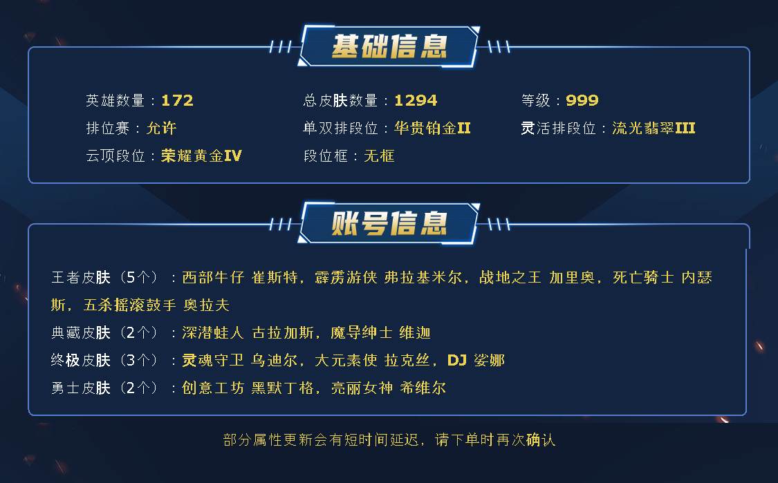 ~~喜欢记得收藏~~可排位~~1300皮全英雄丨730原皮229炫彩丨80神话/至臻/海克斯丨灵魂莲华套丨御星艾希丨剪纸刀妹丨甜心格温丨玉剑剑姬丨电玩女警丨星守风女丨银龙裁决丨替父从军丨FPX锤石丨羊年金克斯丨IG剑姬妖姬丨神龙尊者李青丨KDA卡莎寡妇丨鼠年瑟提德莱文丨EDG悠米厄斐琉斯丨幻灵女枪瑞文金克斯丨青花瓷光辉刀妹伊泽丨至高天奎桑提薇古丝~~租之前尽量查一下游戏ID,确保段位是您需要的,避免浪费您的时间~~请勿挂机逃跑故意送人头,谢谢合作,谢谢~~