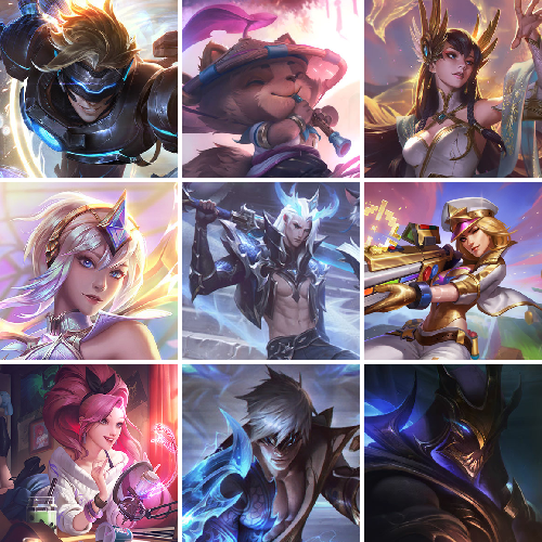 【重要皮肤】至高天凯尔至臻 西部魔影伊芙琳至臻 魂蔷薇烈娜塔至臻 玉剑传说琴仙子至臻 花仙使者卡特琳娜至臻 绝息圣堂厄运小姐至臻 青花瓷丽桑卓至臻 北极星使者沃里克至臻 星之守护者辛德拉至臻 星之守护者艾克至臻 海之歌萨勒芬妮至臻 幻灵战斗猫金克丝至臻 青花瓷拉克丝至臻 神凰行者烈羽焰凰霞至臻 女帝黛安娜至臻 战斗学院蕾欧娜至臻 魔女婕拉至臻 奥术师佐伊至臻 未来战士卢锡安至臻 真实伤害亚索至臻 福牛守护者菲奥娜至臻 源计划逆流塞拉斯至臻 暗星墨菲特至臻 神龙尊者炎龙瑟提至臻 黑夜使者凯隐至臻 神龙尊者均衡之龙沃利贝尔至臻 飞升战神潘森至臻 KDA二代卡莎至臻 烈焰美人薇恩至臻 电玩女神凯特琳至臻 魅惑女巫厄运小姐至臻 魅惑女巫厄运小姐2022至臻 真实伤害奇亚娜至臻 绒毛菲兹至臻 绒毛菲兹2022至臻 玉剑传说武剑仙至臻 玉剑传说武剑仙2022至臻 腥红之月亚托克斯至臻 腥红之月亚托克斯2022至臻 黑夜使者李青至臻 黑夜使者李青2022至臻 灰烬骑士莫德凯撒 灰烬骑士派克 灰烬征服者潘森 海克斯科技安妮 海克斯科技雷克顿 海克斯科技斯维因 海克斯科技吉格斯 海克斯科技波比 海克斯科技拉莫斯 水晶掠夺者卡兹克 暗星科加斯 黎明使者卡尔玛 摄魂使者薇恩 胜利女神娑娜 胜利巨口克格莫 养蜂人辛吉德 电玩女神厄运小姐 星之守护者伊泽瑞尔 玉剑传说舞剑仙 神凰行者烈羽焰凰霞 女帝厄运小姐 天龙之子斯莫德 剪纸仙灵艾瑞莉娅 剪纸仙灵希维尔 神龙烈焰金克丝 春晖神女拉克丝 北辰之威内瑟斯 美猴王孙悟空 定海神珍孙悟空 玉净夜叉凯特琳 紫金罗刹莫甘娜 虎痴之拳蔚 张辽文远 司马懿仲达 王国机神青龙德莱文 王国机神朱雀蕾欧娜 王国机神苍狼瑟提 王国机神白虎贾克斯 王国机神玄武盖伦 胜利女神瑟庄妮 胜利枪神格雷福斯 胜利枪神卢锡安 幽梦玫瑰伊莉丝 觅心魔灵奥莉安娜 觅心女王艾希 觅心萝莉金克丝 冬季仙境奥莉安娜 冰雪风暴希维尔 冬季仙境卡尔玛 狂心冰王图奇 魄罗骑士瑟庄妮 平安夜女神娑娜 魅惑女巫莫甘娜 魅惑女巫崔丝塔娜 魅惑女巫奈德丽 伯爵卡萨丁 大魔王提莫 灵魂收割者索拉卡 海之歌艾希 海之歌永恩 泳池派对凯特琳 泳池派对奥莉安娜 泳池派对塔莉垭 泳池派对厄运小姐 泳池派对塔里克 泳池派对格雷福斯 泳池派对蕾欧娜 电玩战魂赫卡里姆 EDG厄斐琉斯 EDG佛耶戈 EDG格雷福斯 EDG悠米 EDG佐伊 DWG凯南 SKTT1瑞兹 SKTT1雷克顿 SSW锤石 SSW雷恩加尔 SSW图奇 暗杀星奥莉安娜 暗杀星努努和威朗普 暗杀星伊泽瑞尔 Fnatic古拉加斯 Fnatic嘉文四世 Fnatic卡尔萨斯 冰雪节格雷福斯 冰雪节辛吉德 防暴士兵辛吉德 防暴天使凯尔 钢铁之翼艾尼维亚 冠军典狱长锤石 冠军掠夺者卡兹克 鬼影重重魔腾 海贼瑞兹 惊悚派对费德提克 警用试作体K9内瑟斯 南瓜头费德提克 女猎手希维尔 圣诞精灵崔丝塔娜 圣诞开心鬼提莫 圣诞狂欢基兰 圣诞狂欢努努和威朗普 圣诞老人古拉加斯 圣诞玩偶波比 圣诞驯鹿克格莫 外星装甲库奇 无头骑士赫卡里姆 喜庆之树茂凯 幸福女神乐芙兰 雪默丁格 野兽猎人德莱文 野兽猎人瑟庄妮 野兽猎人泰达米尔 永恒之森乐芙兰 勇者阿狸 勇者奈德丽 征服者诺提勒斯 暗影沃里克 波比的巧克力工坊 都铎王朝图奇 十周年纪念安妮 源代码乐芙兰 神凰行者瑞羽圣凰艾尼维亚 胜利凤凰艾尼维亚 大元素使拉克丝 未来战士伊泽瑞尔 KDAALLOUT萨勒芬妮独立音乐人 KDAALLOUT萨勒芬妮明日新星 KDAALLOUT萨勒芬妮超级巨星 绝息圣堂洛