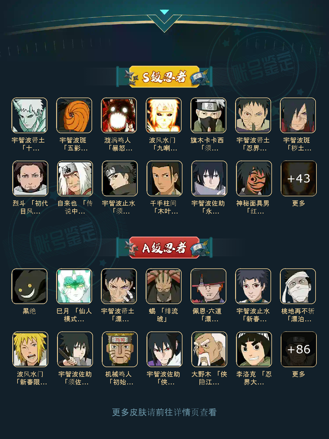 白面具 须佐卡卡西 小胡子鬼灯幻月 雷影 土影 无 佩恩 百战佩恩 青年柱间 创立初代 秽土斑 青年斑 解斑 须佐止水 虎皮 破面带土 红夜带土 罗砂 秽土三代风影 忍战雷影 三代雷影 金角银角 秽土半藏 忍战大野木 小土豆 天道超 大筒木桃式 大筒木金式 钢铁之躯凯 桀骜之刃阿斯玛 狂野之鲨鬼鲛 飞段 黑飞段 百豪樱 忍战李 大卡卡西 五代水影照美冥 宇智波鼬 仙鸣 九尾查克拉鸣人 鹰佐 奇拉比 青年艾 半蛇兜 晓蛇 新春鼬 面麻 须佐佐助 疾风咒印佐助 忍战宁次 忍战天天 最终章雏田 幻容卡卡西 神卡 忍战卡卡西 泳装卡卡西 忍战凯 青春哥 惊门凯 爱情哥 新春止水 新春水门 青年水门 青水 新春我爱罗 泳装照美冥 侠隐照美冥 侠隐纲手 侠隐兜 漂泊再不斩 漂泊佩恩 漂泊二代 漂泊小南 漂泊佩恩 三船 青年三船 青年长门 泳装南 新春南 黑绝 新春大蛇丸 晓创生角度 晓创生蝎 晓创生飞段 泳装鼬 鲛肌融合鬼鲛 新春迪达拉 秽土迪达拉 恶灵之影飞段 暴怒带土 忍战黄土 卑留呼 桃博 黑土