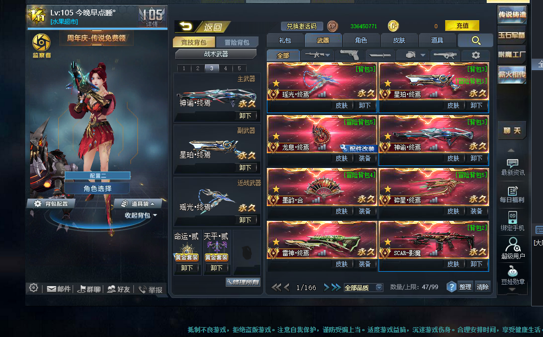 传说武器:星珀终焉◆RPK主宰◆龙息·终焉◆神谕·终焉◆AK47主宰◆墨韵·合◆碎星·终焉◆雷神·终焉◆SCAR-影魔◆无尽光影·终焉◆M4A1无限EX◆屠魔◆AK47天神◆