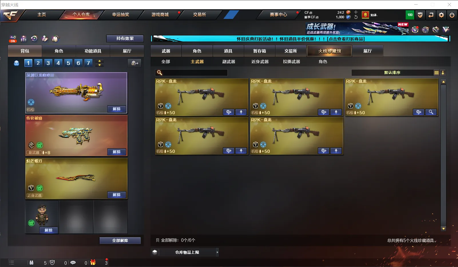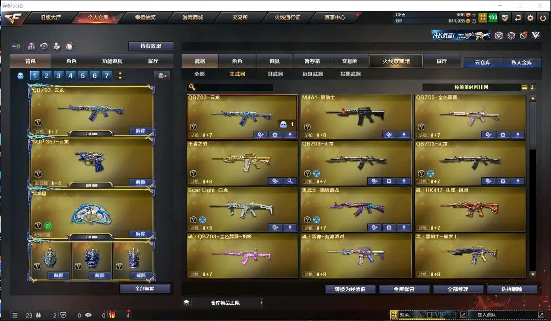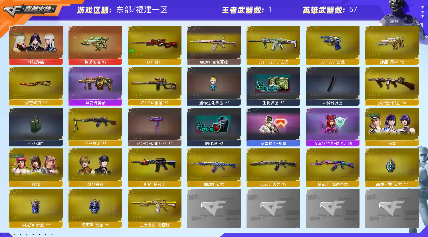 武器:六烈龙 斯泰尔-蝴蝶 六盘龙 深渊巨龙咆哮可跳着 2炽芒蝶刃 2传说破晓 VSK-94-金蚀2 异变镇魔者 3轻型军用手斧-镜 2迷你生化手雷 炽火炎龙 2云龙扇 2天罚(六盘六烈)