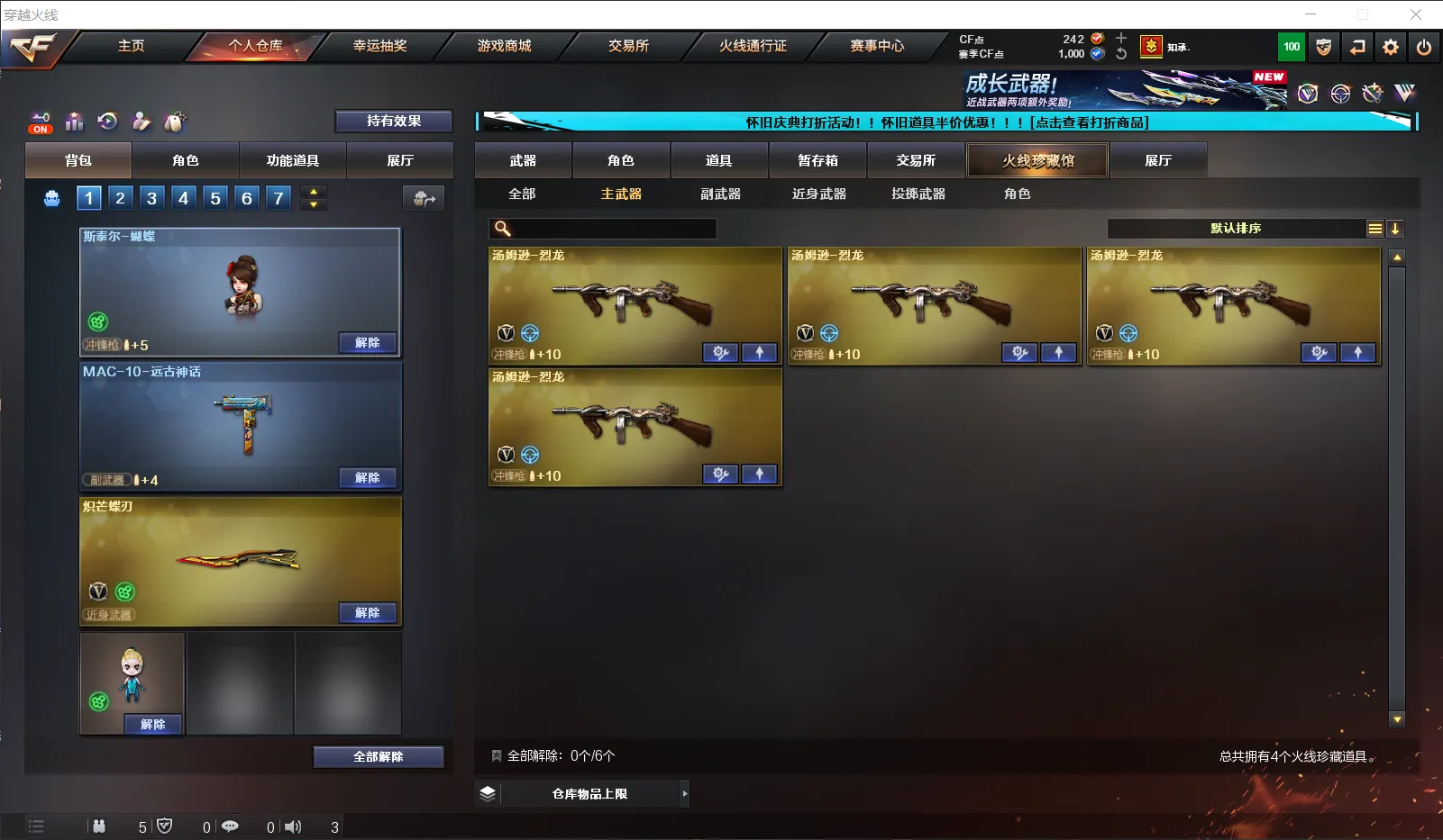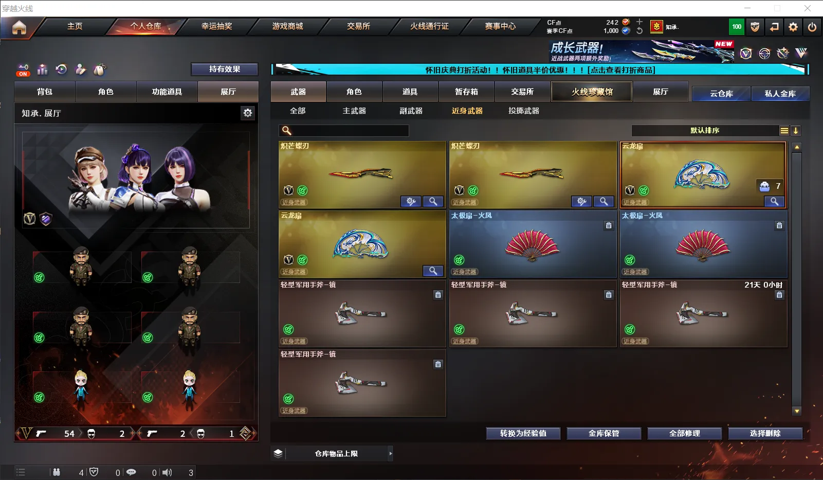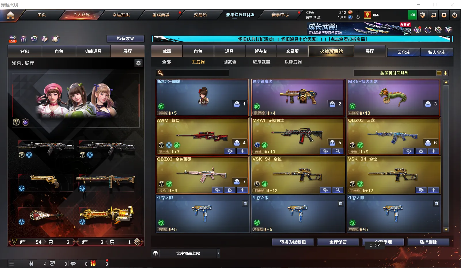 武器:六烈龙 斯泰尔-蝴蝶 六盘龙 深渊巨龙咆哮可跳着 2炽芒蝶刃 2传说破晓 VSK-94-金蚀2 异变镇魔者 3轻型军用手斧-镜 2迷你生化手雷 炽火炎龙 2云龙扇 2天罚(六盘六烈)