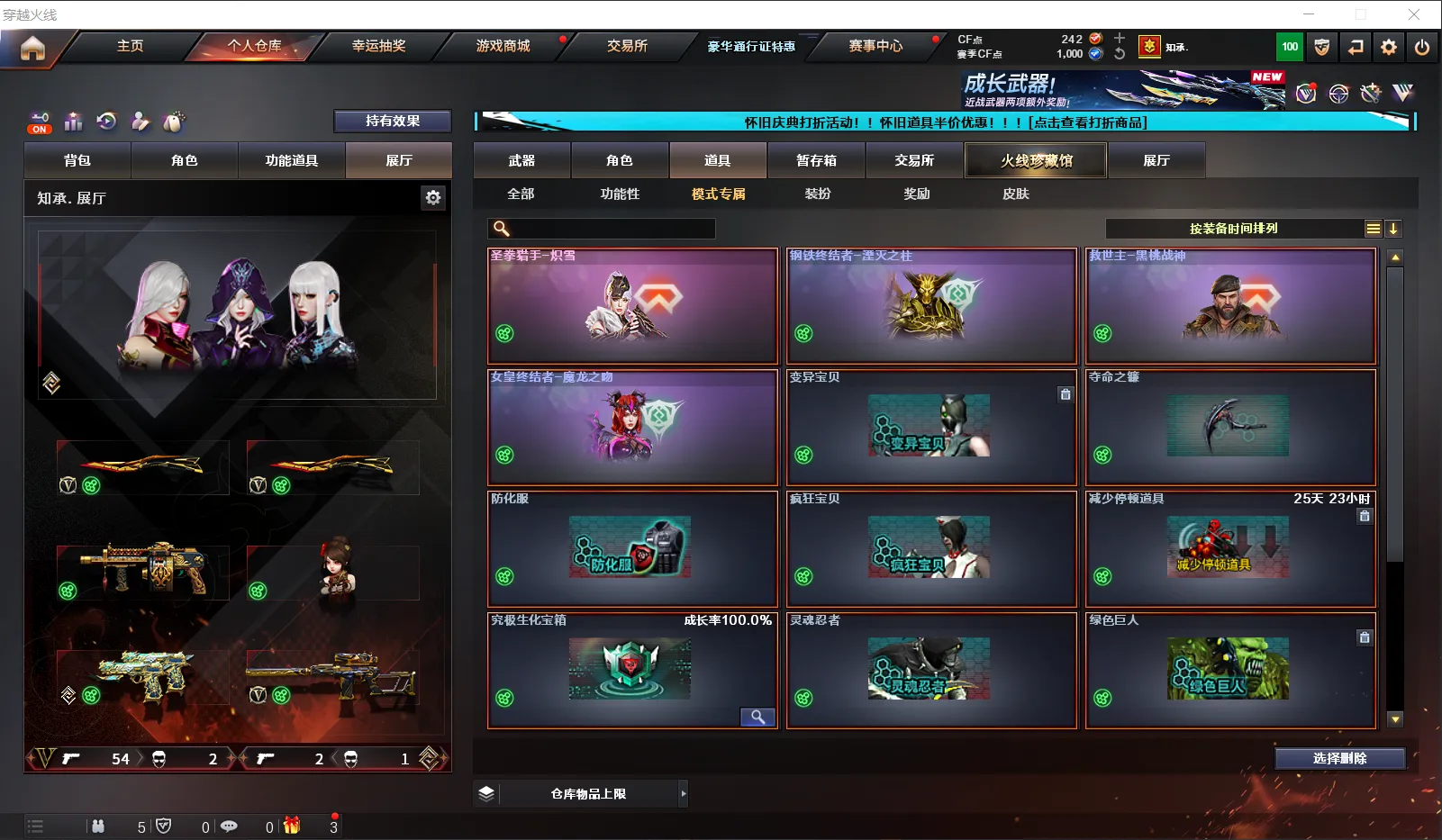 道具:冲峰枪弹夹 生化弹夹 变异宝贝 疯狂宝贝 灵魂忍者 妖姬 防护服 夺命之镰 烟雾保护头盔 闪光护目镜 防弹衣 防弹帽