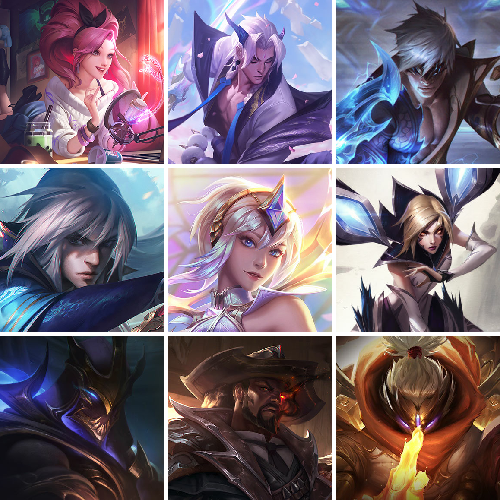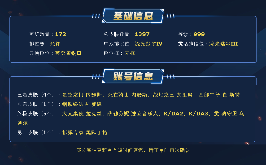 【重要皮肤】魔域梦魇泽丽至臻 青花瓷千珏至臻 天龙之子伊泽瑞尔至臻 北极星钢影卡蜜尔至臻 魔女阿卡丽至臻 斗魂觉醒派克至臻 DRX亚托克斯至臻 北极星使者沃里克至臻 太空律动魔音海妖娜美至臻 海珀利安小队X09星环灵风迦娜至臻 西部魔影猎天使恶魔泰隆至臻 青花瓷拉克丝至臻 神凰行者烈羽焰凰霞至臻 女帝黛安娜至臻 战斗学院蕾欧娜至臻 魔女婕拉至臻 真实伤害赛娜至臻 星之守护者索拉卡至臻 灵能特工伊泽瑞尔至臻 福牛守护者菲奥娜至臻 王国机神玄武盖伦至臻 暗星墨菲特至臻 征服者贾克斯至臻 KDA二代卡莎至臻 KDA一代卡莎至臻 绒毛菲兹至臻 绒毛菲兹2022至臻 腥红之月亚托克斯至臻 腥红之月亚托克斯2022至臻 未来战士锤石至臻 未来战士锤石2022至臻 黑夜使者李青至臻 黑夜使者李青2022至臻 灰烬骑士派克 灰烬杀手塞拉斯 海克斯科技雷克顿 海克斯科技克格莫 海克斯科技波比 水晶掠夺者卡兹克 永恒之森奥恩 零之枪骑赫卡里姆 摄魂使者薇恩 胜利剑圣易 胜利女神娑娜 胜利之王泰达米尔 胜利巨口克格莫 养蜂人辛吉德 勇敢的心德莱厄斯 电玩女神厄运小姐 玉剑传说无影 灵能特工易 银龙裁决泰隆 天龙之子卡莎 天龙之子斯莫德 替父从军花木兰 碧玉之牙卡西奥佩娅 春晖神女拉克丝 你看见过我的熊猫吗安妮 北辰之威内瑟斯 南天之怒沃里克 美猴王孙悟空 玉净夜叉凯特琳 紫金罗刹莫甘娜 广寒仙子嫦娥 张辽文远 司马懿仲达 纳财大帝塔姆 醒狮克格莫 神龙之翼库奇 王国机神朱雀蕾欧娜 王国机神苍狼瑟提 王国机神白虎贾克斯 福牛守护者厄斐琉斯 福牛守护者德莱厄斯 胜利女神瑟庄妮 胜利枪神卢锡安 幽梦玫瑰伊莉丝 甜心之翎洛 甜心宝贝安妮 觅心猎手薇恩 北极星使者彗 北极星神黛安娜 持胡萝卜的雪人易 冰封王子蒙多 冰雪女神辛德拉 魄罗骑士瑟庄妮 平安夜女神娑娜 魅惑女巫乐芙兰 魅惑女巫赛娜 魅惑女巫莫甘娜 魅惑女巫崔丝塔娜 魅惑女巫伊莉丝 伯爵卡萨丁 灵魂收割者索拉卡 勇敢的心德莱厄斯 海之歌泽丽 泳池派对凯特琳 泳池派对普朗克 泳池派对奥莉安娜 EDG厄斐琉斯 FPX普朗克 iG卡莎 iG菲奥娜 SSG洛 SSG伊泽瑞尔 SKTT1烬 SKTT1奥拉夫 SSW图奇 SSW辛吉德 Fnatic迦娜 Fnatic嘉文四世 Fnatic卡尔萨斯 冰雪节格雷福斯 冰雪节辛吉德 防暴士兵格雷福斯 防暴士兵辛吉德 冠军之矛卡莉丝塔 冠军之血希瓦娜 冠军之隐劫 鬼影重重魔腾 圣诞精灵崔丝塔娜 圣诞老人古拉加斯 圣诞玩偶波比 喜庆之树茂凯 幸福女神乐芙兰 雪默丁格 野兽猎人瑟庄妮 勇者奈德丽 魅惑女巫菲奥娜 魅惑女巫辛德拉 阿木木主人不要我了 波比的巧克力工坊 都铎王朝图奇 十五周年纪念希维尔 十周年纪念安妮 源代码乐芙兰 胜利凤凰艾尼维亚 大元素使拉克丝 灵魂守卫乌迪尔 KDAALLOUT萨勒芬妮独立音乐人 KDAALLOUT萨勒芬妮明日新星 KDAALLOUT萨勒芬妮超级巨星