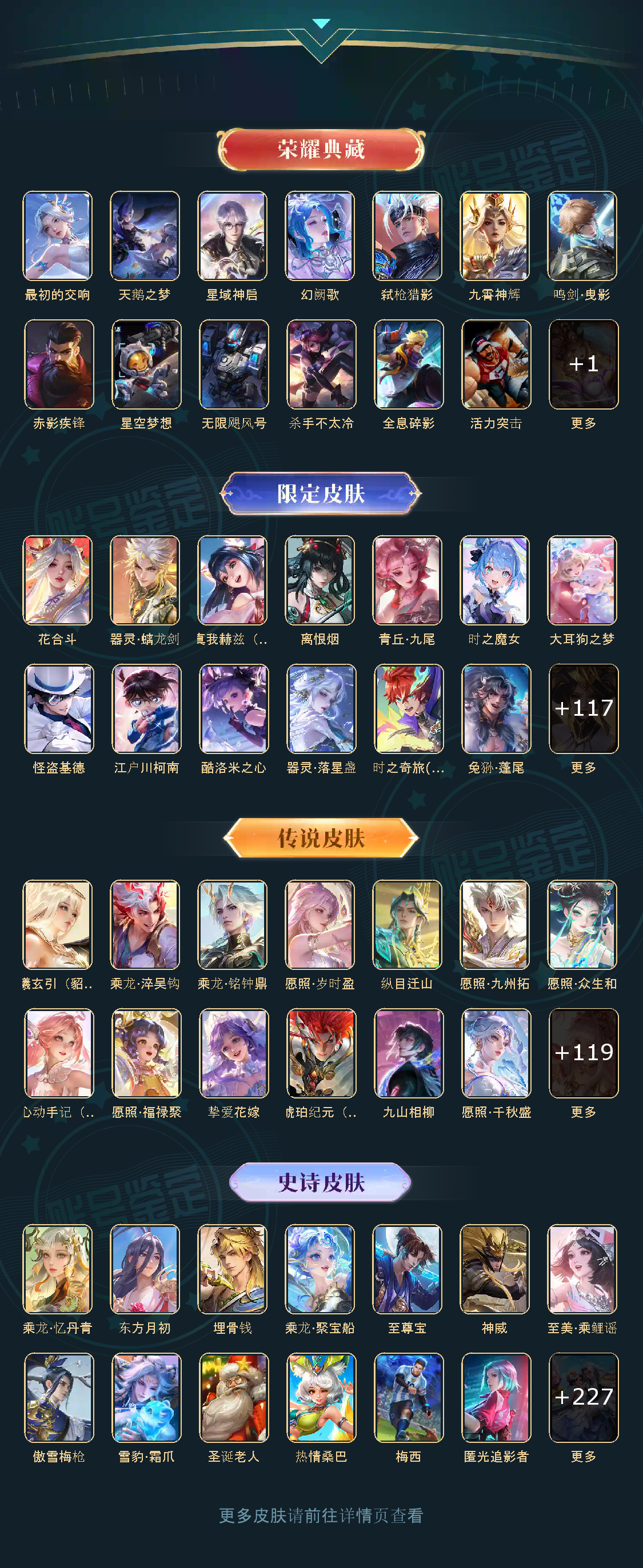 贵族等级V10无双贵族,英雄数量123,典藏皮肤数14,皮肤数量670,冰锋战神/街头霸王/天鹅之梦/纯白花嫁/天魔缭乱/至尊宝/杀手不太冷/真爱至上/圣诞老人/王者之锤/凤求凰/热情桑巴/逐梦之影/武陵仙君/神奇女侠/星空梦想/梅西/无限飓风号/黄金狮子座/一生所爱/全息碎影/大圣娶亲/冰霜恋舞曲/青龙志/白虎志/朱雀志/活力突击/太华/久胜战神/飞衡/梁祝/倪克斯神谕/白鹤梁神女/匿光追影者/鸣剑·曳影/遇见胡旋/龙胆/星域神启/李逍遥/武圣/奔雷神使/孙行者/玉兔公主/补天/异界灵契/神威/启示之音/傲雪梅枪/淬星耀世/时雨天司