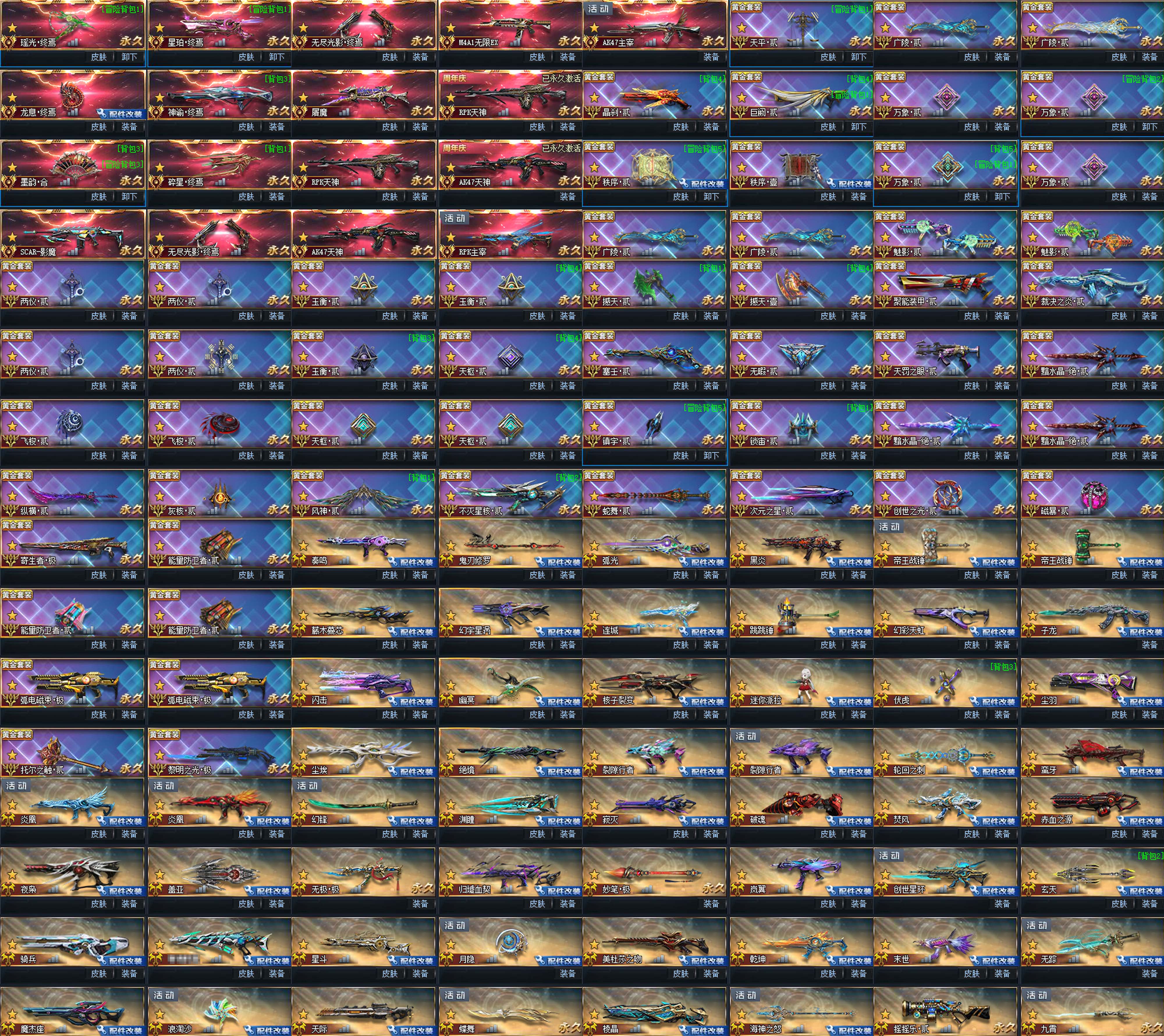 传说武器:瑶光终焉◆星珀终焉◆RPK主宰◆龙息·终焉◆神谕·终焉◆AK47主宰◆墨韵·合◆碎星·终焉◆SCAR-影魔◆无尽光影·终焉◆M4A1无限EX◆屠魔◆AK47天神◆