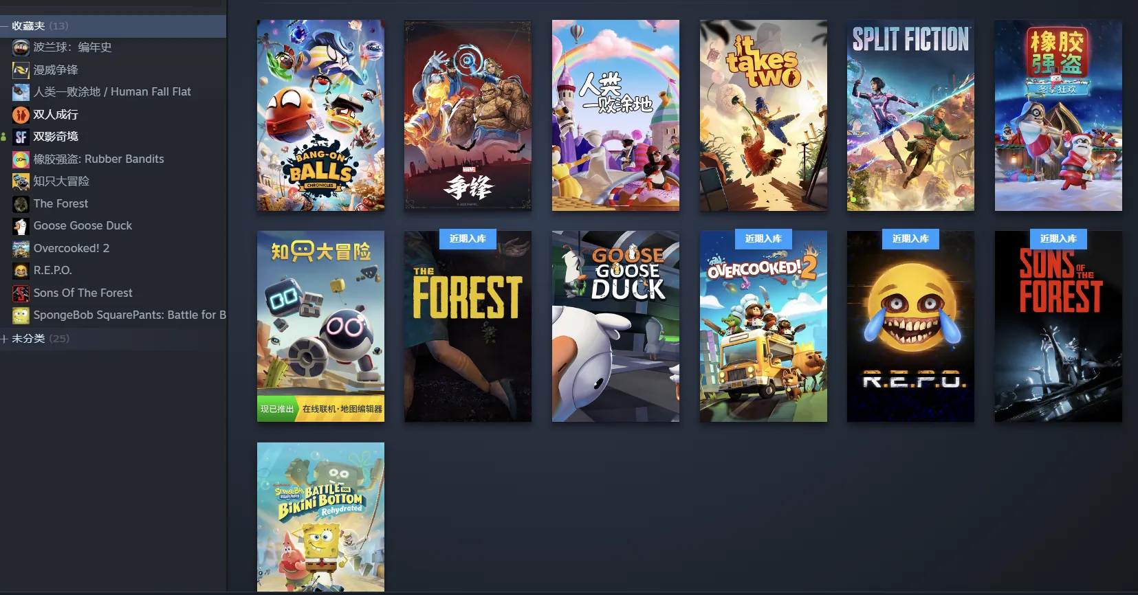 PEAK、大富翁11、胡闹厨房2/分手厨房(Overcooked! 2)、泡姆泡姆、双影奇境、双人成行、小动物餐吧(Party Club)、REPO(R.E.P.O.)、森林之子(Sons Of The Forest)、迷失森林(The Forest)、海绵宝宝比基尼海滩之战/海绵宝宝争霸比基尼海滩(SpongeBob)、人类一败涂地、波兰球编年史、橡胶强盗、grip战斗汽车(GRIP: Combat Racing)、知只大冒险、漫威争锋、星界战士(Astral Ascent)、同舟共济(Ship of Fools)