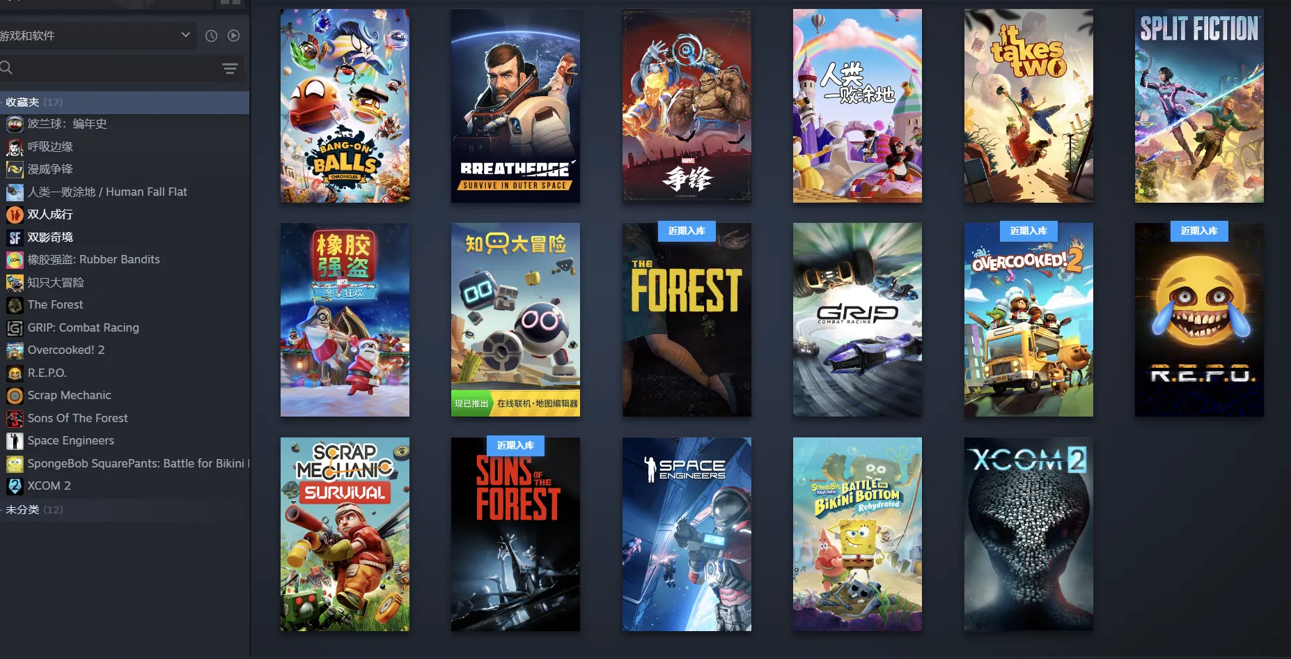PEAK、大富翁11、胡闹厨房2/分手厨房(Overcooked! 2)、泡姆泡姆、双影奇境、双人成行、小动物餐吧(Party Club)、REPO(R.E.P.O.)、森林之子(Sons Of The Forest)、迷失森林(The Forest)、海绵宝宝比基尼海滩之战/海绵宝宝争霸比基尼海滩(SpongeBob)、人类一败涂地、波兰球编年史、橡胶强盗、grip战斗汽车(GRIP: Combat Racing)、知只大冒险、漫威争锋、呼吸边缘(breathedge)、太空工程师(Space Engineers)、幽浮2(xcom2)、废品机械师、星界战士(Astral Ascent)、同舟共济(Ship of Fools)