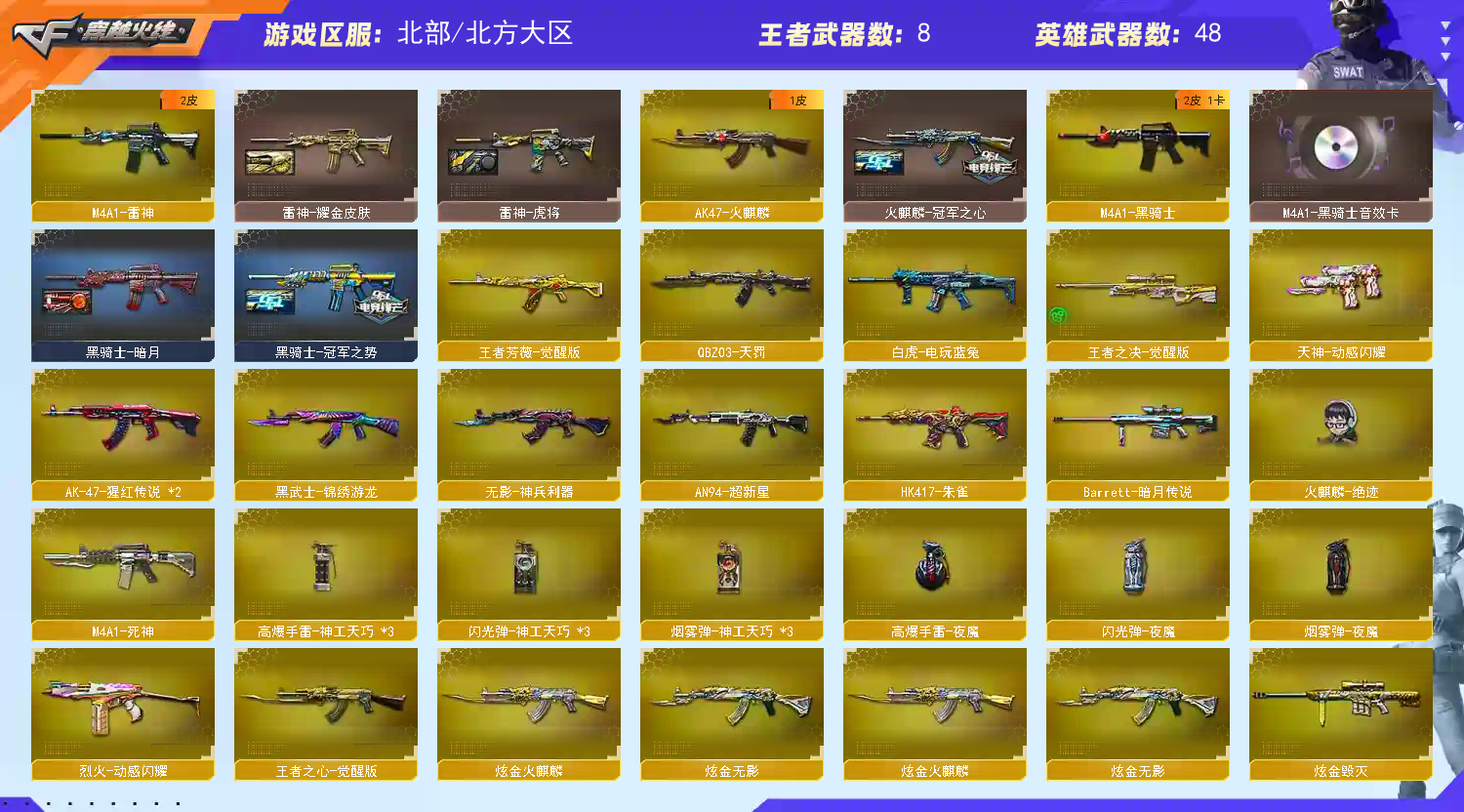 🔥热门枪械:传说灵眸+王者芳薇+王者之心+朱雀+手枪满配+电玩蓝兔+王者之决+炫金火麒麟+炫金无影+炫金骑士+冠特冠刃🔥