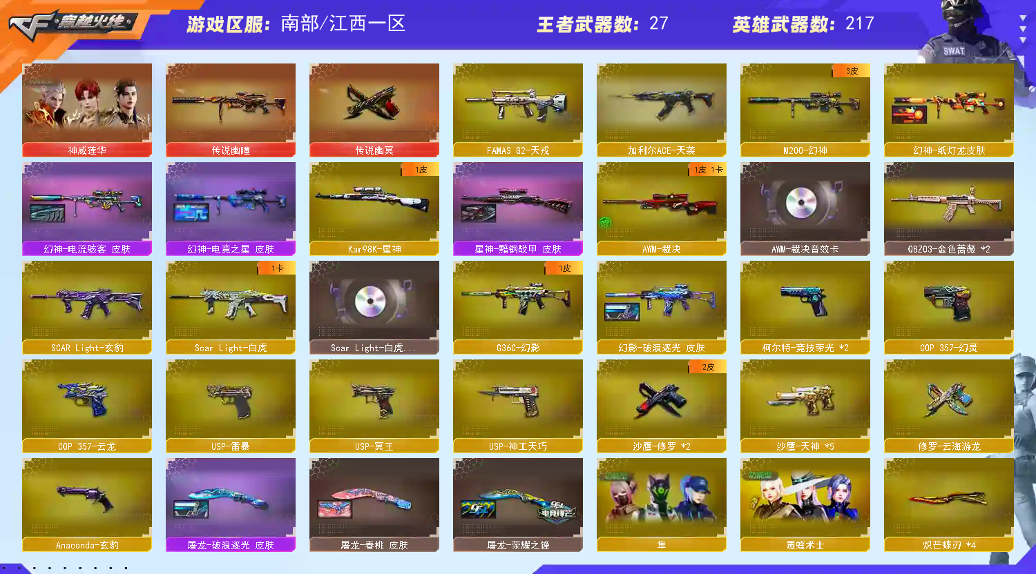 【副武】︰传说幽冥、usp雷暴、竞技荣光柯尔特x2、神功usp、沙鹰修罗x2、COP云龙、天秤座、沙鹰天神x3、胜利之火、凤凰之火、Cop赤龙、沙鹰青龙【近身】:蝴蝶刀x2、云龙扇、唐刀神功天巧、麒麟刺、屠龙、龙鳞、干将莫邪、龙啸x2、金砖、擎天x2、双子座、巨蟹座、啸天(拳套)、雷暴斩神刀、堕天神麒麟刺、堕天神龙啸、幻灵之锋x3
