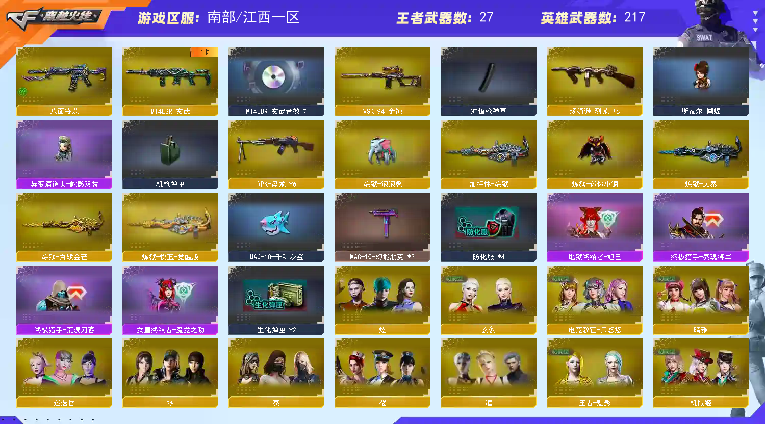 【角色】:四防隼、四防云悠悠、四防晴雅、王者魅影、灵狐者职业经理、炫、樱、迷迭香、紫霞、铁扇公主、夜玫瑰x、飞虎队、海豹突击队、潘多拉、零、堕天使、灵狐者、娟娟、奥摩x、葵、邓紫棋、救世主、救世复仇【王者】:王者虎魄、王者之怒、王者之心、王者金色蔷薇qbz03、炼狱-悦蓝、王者之城、王者蔷薇炮、王者之圣、王者之光、王者之啸x2、雷霆王者高爆x5、雷霆王者烟雾弹x4、雷霆王者闪光弹x2