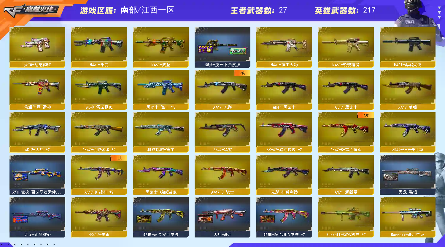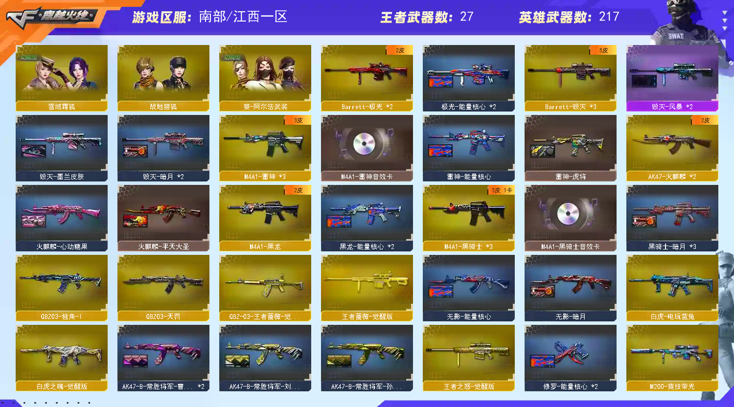 【主武】︰传说幽瞳、炼狱泡泡象、幻神m200、g36c幻影、竞技荣光m200、神功天巧m4、蝴蝶斯太尔、天龙、雷神、盘龙x6、烈龙x6、黑骑士x2、毁灭x3、ak12天启x2、白虎、猎神、炫金骑士、无影、火麒麟、猩红传说x2、ak-b战士、ak-b战神、ak-b先身士卒、ak-b常胜将军、贝雷塔、金牛座、极光x3、苍雷、黑龙m4、AK枪王、天蝎座、黑武士、征服者、死神m4、白羊座、千变、乱世、处女座、射手座、天启、超新星、神罚、凤凰之怒、武圣、死亡之眼、炼狱、斯泰尔巧克力、、火麒麟暗月、火麒麟能量核心、黑武士暗月、黑武士能量核心、机械迷城、源-雷神、QBZ03-金色蔷薇x2、M200赤血龙魂、HK417-赤血龙魂、激光毁灭者3级、雷神-暗月、神圣爆裂者Ⅲ