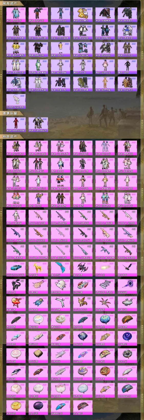 【稀有资产】套装-雪国幻梦/套装-怪诞乔克/角色-Mark.06/套装-派对舞王/套装-赤蝎幽灵/套装-都市猎人/套装-沙漠守护者/套装-天网终结者/套装-奇异狩猎者/套装-胖达圆圆/套装-暗夜魅影/套装-浪漫天命/套装-潮萌小黄鸭/套装-暗影哥特/套装-龟仙人/套装-迅捷狂鲨/套装-胖达团团/套装-六号树人/套装-兔兔白日梦/玩偶服-卖崽青蛙/角色-都市丽猫/角色-许七安/角色-临安公主/角色-2B战斗服款/套装-缤纷假日/套装-动感兔斯基人偶服/套装-恶魔人蛛/套装-狂沙舞者/套装-萌神柯基/套装-青涩年华/信号枪-彩虹独角兽