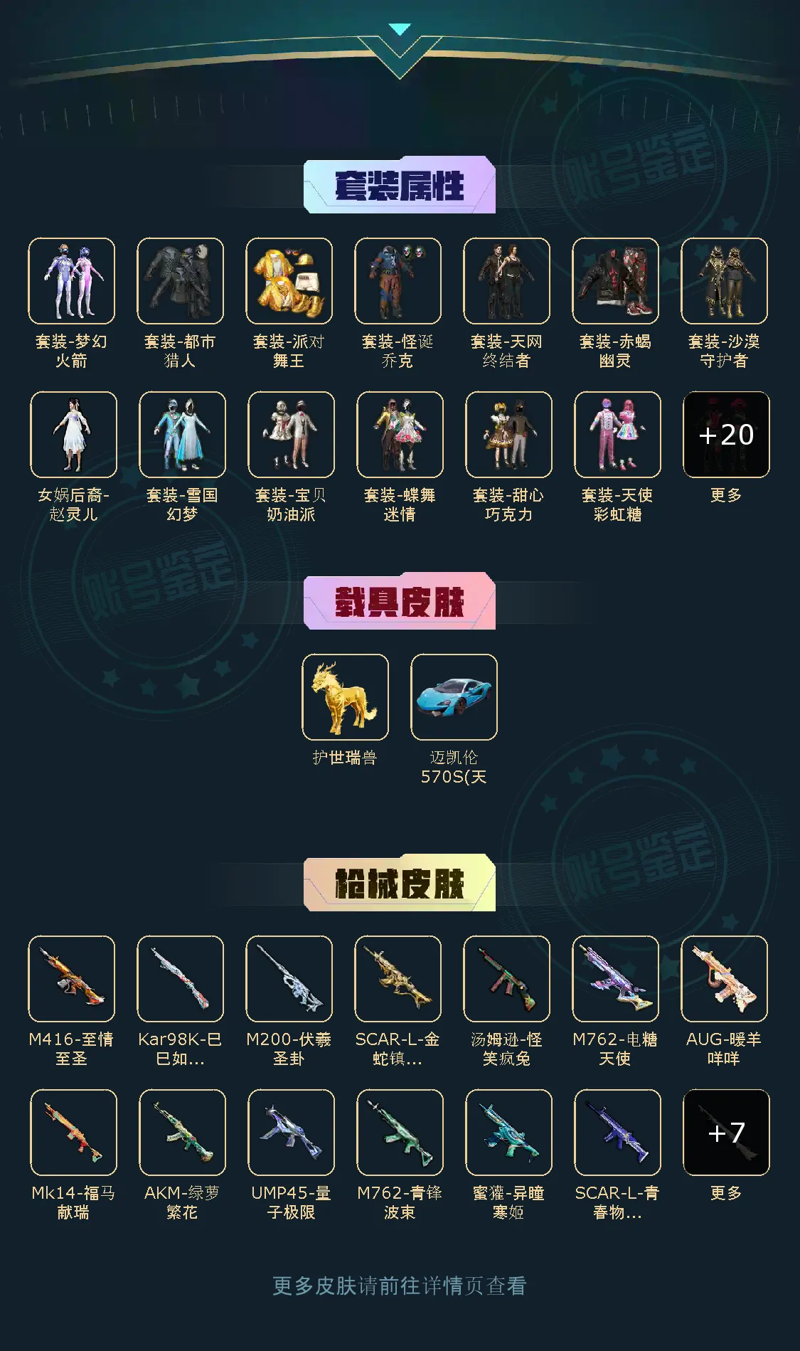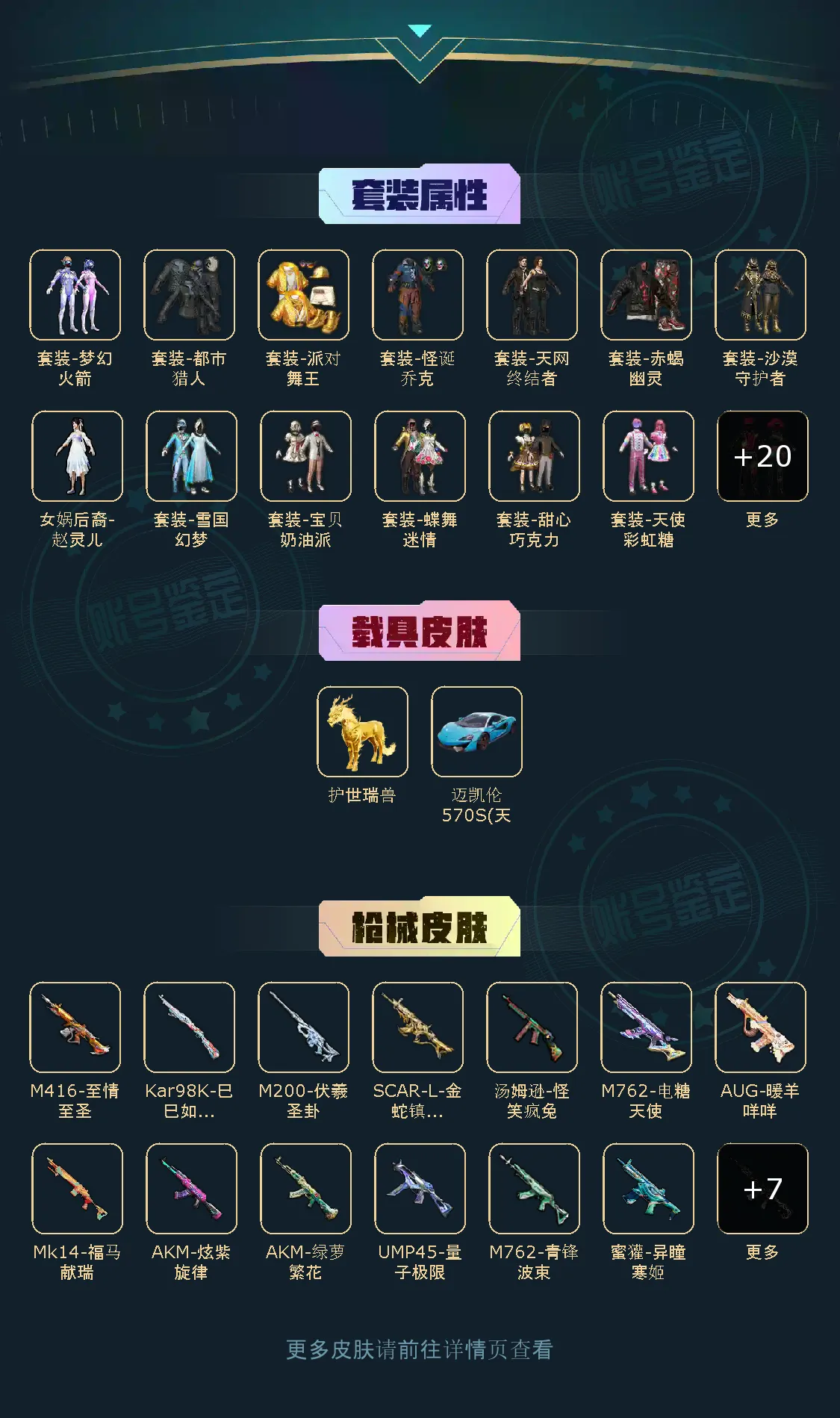 【粉色枪皮】M416-心之恋语/AKM-炫紫旋律/AKM-绿萝繁花/SCAR-L-金蛇镇世/SCAR-L-锦绣绵绵/SCAR-L-青春物语/M416-至情至圣/M416-电玩时刻/M416-墨龙九天/AUG-暖羊咩咩/M762-电糖天使/M762-青锋波束/Kar98K-巳巳如意/M24-莲影清波/M200-伏羲圣卦/UMP45-量子极限/汤姆逊-怪笑疯兔