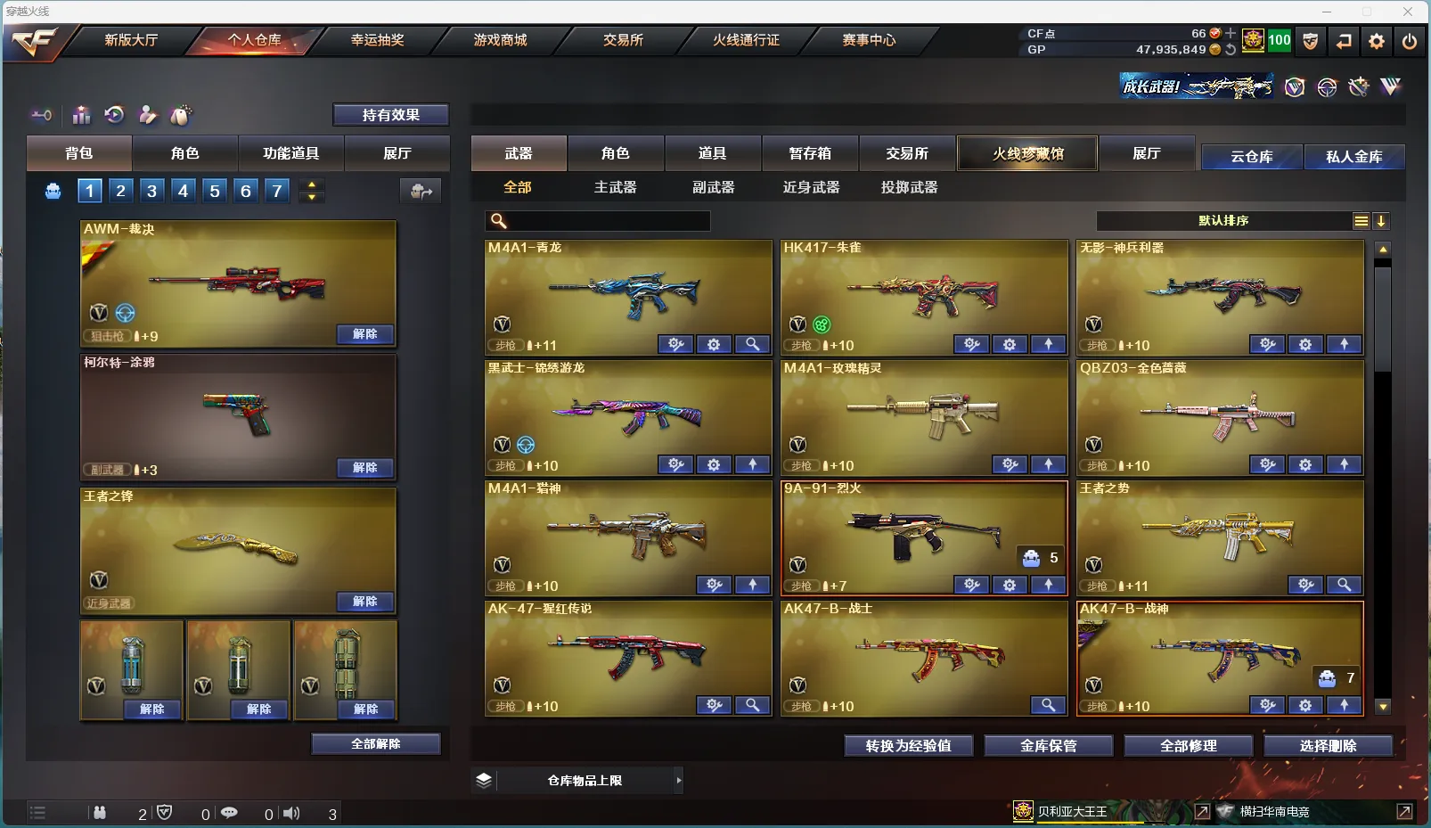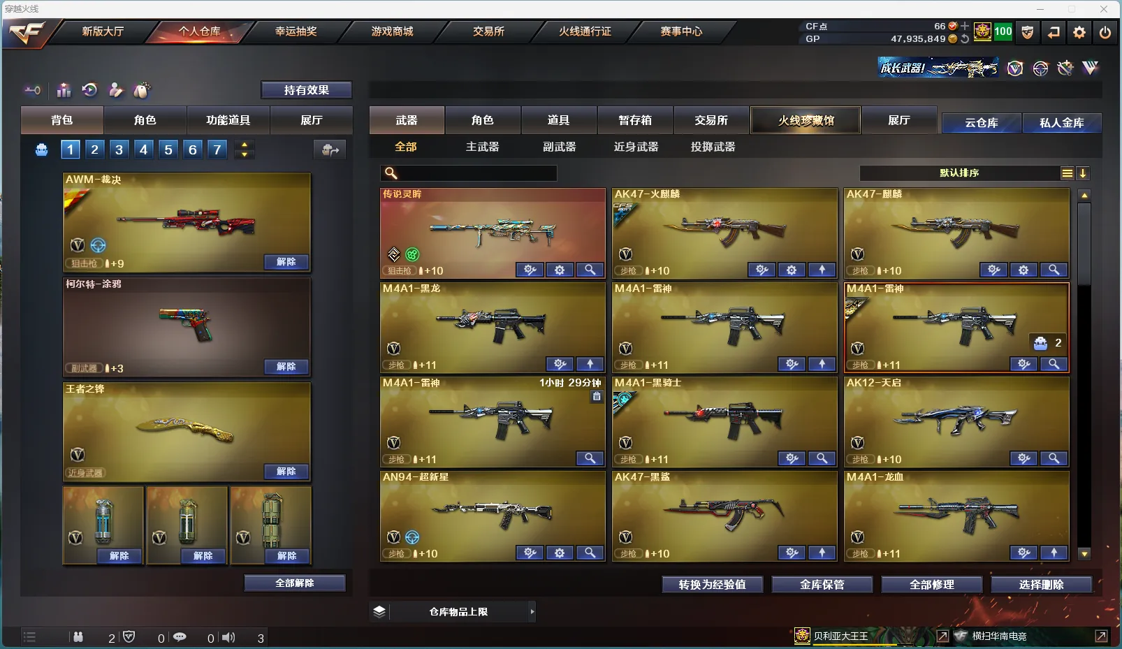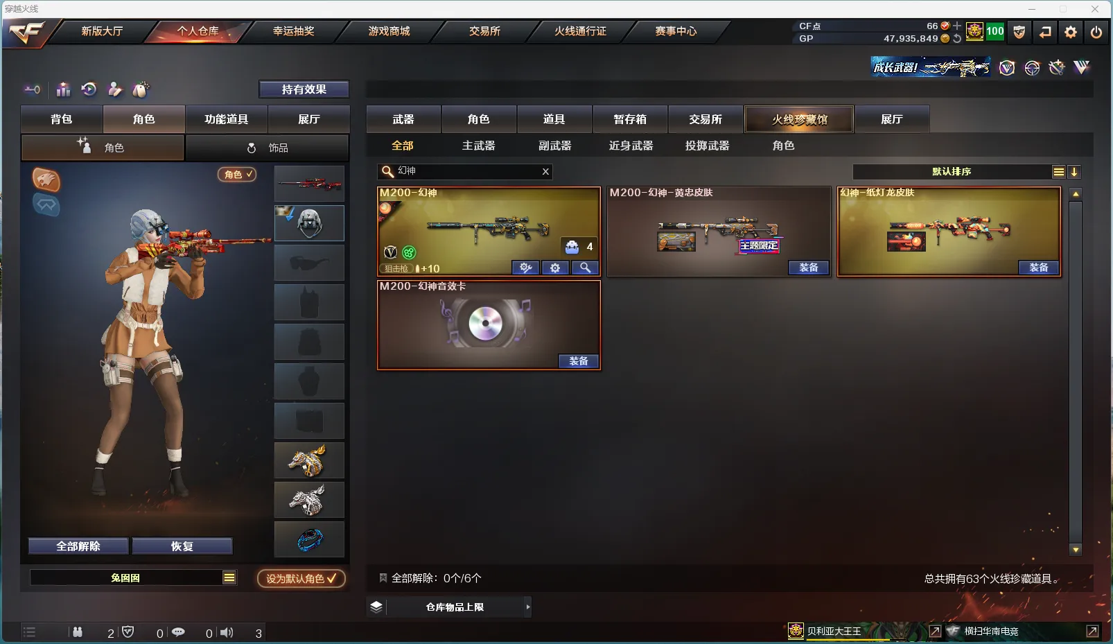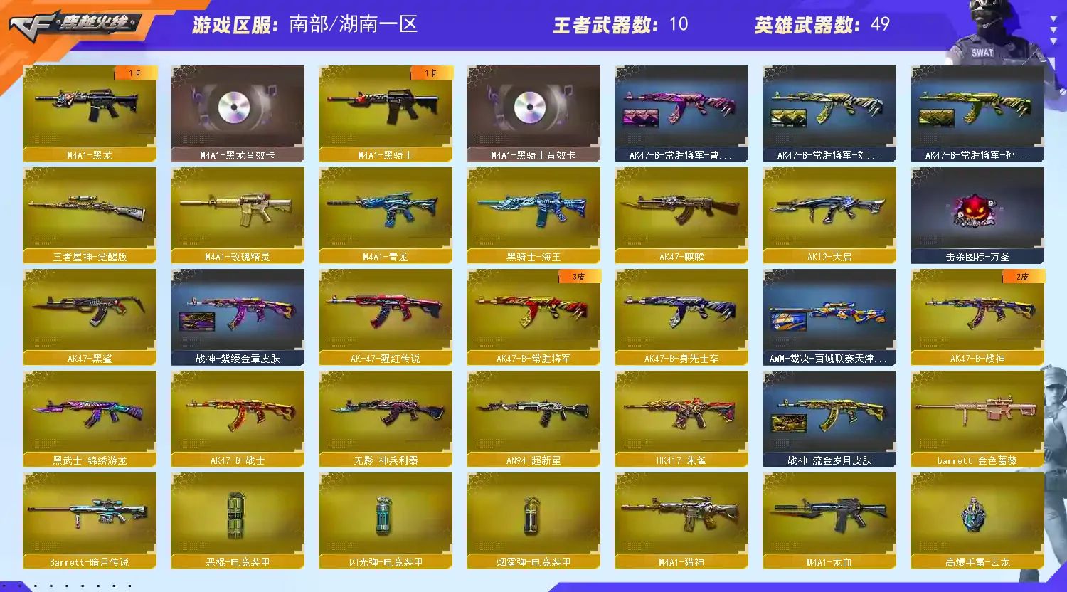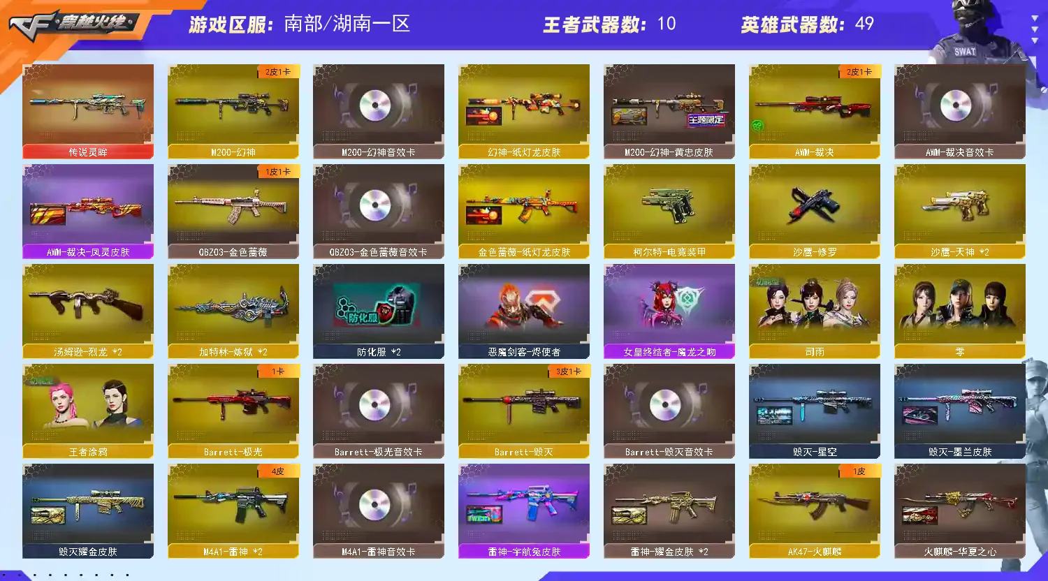 11王者1传说 幻神三件套】【传说武器】 传说灵眸 【王者武器】 王者炎心觉醒版 王者之势觉醒版 王者星神觉醒版 王者之锋觉醒版 高爆手雷-雷霆王者x3 闪光弹-雷霆王者x2 王者之魄闪光弹 【英雄武器】 M200-幻神(音效卡+皮肤) AK47-火麒麟 AK47-麒麟 M4A1-黑龙 M4A1-雷神 M4A1-黑骑士 AK12-天启 AN94-超新星 AK47-黑鲨 M4A1-龙血 M4A1-青龙 HK417-朱雀 无影-神兵利器 黑武士-锦绣游龙 M4A1-玫瑰精灵 QBZ03-金色蔷薇 M4A1-猎神 9A-91-烈火 黑骑士-海王 AK47-B-身先士卒 AK47-B-常胜将军 AWM-天龙 Barrett-毁灭 Barrett-极光 AWM-裁决 Barrett-金色蔷薇 Barrett-暗月传说 加特林-炼狱 汤姆逊-烈龙 沙鹰-修罗 沙鹰-天神 柯尔特-电竞装甲 屠龙 龙啸 擎天 麒麟刺 恶棍-电竞装甲 高爆手雷-云龙 闪光弹-电竞装甲 烟雾弹-电竞装甲 烟雾弹-古蛇迷踪 【角色】 零 蛇隐宗 司雨 王者涂鸦 【音效卡】 Barrett-毁灭音效卡 M4A1-雷神音效卡 M4A1-黑骑士音效卡 M4A1-黑龙音效卡 AWM-裁决音效卡 M200-幻神音效卡 QBZ03-金色蔷薇音效卡 Barrett-极光音效卡 【皮肤】 黑骑士-白马银枪 金色蔷薇-纸灯龙皮肤 幻神-纸灯龙皮肤 雷神-宇航兔皮肤 AWM-裁决-凤灵皮肤 雷神-源计划2.0专属 皮肤 毁灭-AG-CFPLS15冠军 毁灭-星空 雷神-耀金皮肤 毁灭耀金皮肤 毁灭-墨兰 皮肤 AWM-裁决-百城联赛天津皮肤 烈龙-星空 M200-幻神-黄忠皮肤 雷神-白鲨-CFPLS14冠军 火麒麟-华夏之心 火麒麟-CF STAR