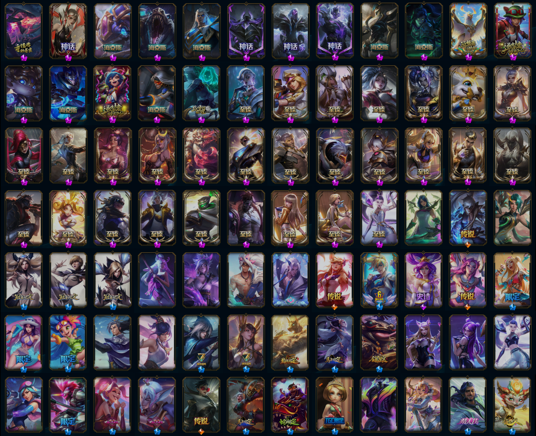 【传说皮肤】黯黑魔龙希瓦娜 黯晶凤凰艾尼维亚 暗星尊烬 奥德赛凯隐 霸天零式赛恩 霸天异形卡兹克 冰川巨兽墨菲特 冰霜亚龙希瓦娜 冰霜之刃艾瑞莉娅 苍穹之光韦鲁斯 大天使长米迦勒凯尔 电玩女神娑娜 第三类接触黑默丁格 地狱行者孙悟空 地狱之门卫士加里奥 恶魔男爵瑞兹 恶魔之刃泰达米尔 符文战熊沃利贝尔 钢铁之翼凯尔 光明哨兵薇恩 灌篮高手德莱厄斯 黑夜使者索拉卡 黑夜使者亚索 合金巨兽努努和威朗普 红色男爵库奇 金牌主播德莱文 枯萎之壤泽拉斯 炼狱魔犬内瑟斯 烈焰雄心崔丝塔娜 黎明使者锐雯 黎明使者永恩 灵能特工娑娜 陆地王者4WD布里茨 律政大亨蒙多 魔幻卡牌崔斯特 女皇艾希 女警狙击凯特琳 女校长菲奥娜 欧米伽小队幽灵特工 偶像歌手阿狸 苹果机器人布里茨 蔷薇绅士杰斯 丧尸布兰德 上古战魂魔腾 神龙尊者圣龙李青 神拳李青 绅士科加斯 神王德莱厄斯 双重冰晶艾尼维亚 死亡骑士盖伦 天煞劫 铁哥们儿奥拉夫 提莫约德尔人的一大步 屠龙勇士潘森 未来战士凯特琳 西部魔影大小姐蕾欧娜 西部魔影卢锡安 西部天使赛娜 邪鸦魅影乐芙兰 腥红之月鬼武姬阿卡丽 星之守护者阿狸 星之守护者金克丝 星之守护者卡莎 星之守护者霞 血石领主弗拉基米尔 焰尾妖狐阿狸 影执事劫 银河魔装机神兰博 泳池派对吉格斯 源计划净化薇恩 源计划联合艾希 源计划林易 源计划泯灭雷克顿 约德尔国队长提莫 宇航员诺提勒斯 战场女武神凯尔 战地机甲厄加特 战地巨兽科加斯 战斗学院伊泽瑞尔 真实伤害艾克 至尊魔女莫甘娜 最终BOSS维迦