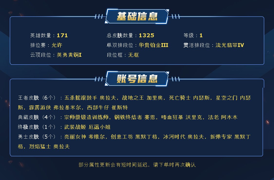 ~~喜欢记得收藏~~可排位~~1165皮全英雄丨868原皮297炫彩~~租之前尽量查一下游戏ID,确保段位是您需要的,避免浪费您的时间~~请勿挂机逃跑故意送人头,谢谢合作,谢谢~~