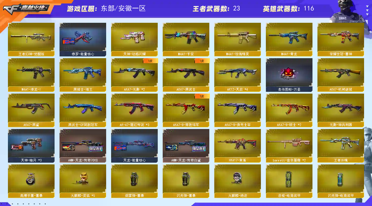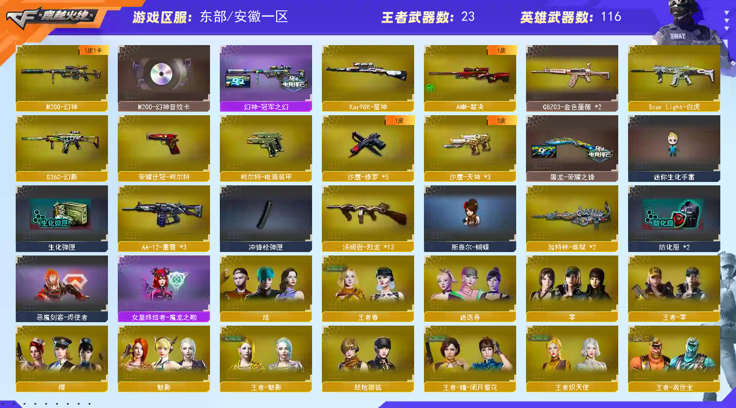 安徽一区 vip1 119v【m200-幻神+幻神-冠军之冠+m200-幻神音效卡】【王者幻神】【98k星神】【荣耀世冠-柯尔特】【g36c-幻影】【scarlight-白虎】【qbz03-金色蔷薇】【6烈龙 斯泰尔蝴蝶 死亡之眼】【m4青龙 hk417朱雀 】【火麒麟+火麒麟音效卡+cfs2018皮肤+ag战队皮肤+战神关羽皮肤+横秒之巅皮肤】【雷神+雷神音效卡+雷神n9皮肤+雷神-荣耀之魄皮肤】【黑骑士+黑骑士音效卡+黑骑士-冠军之势皮肤】【毁灭+毁灭音效卡 +毁灭-ag15冠军皮肤+毁灭- sv16冠军皮肤+barrett-毁灭-2020mvp皮肤 +barrett-毁灭-cfs2018皮肤】【屠龙-荣耀之锋皮肤】【王者岩心 王者之心 王者之鲨 王者冰魄 王者之戮 王者之光2 王者之决 王者之怒 王者之锋2 王者之击】【千变 黑龙2 无影2 死神 黑武士 天启4 机械迷城 黑鲨 龙血 无影神兵利器 烈火动感闪耀 玫瑰精灵 猎神 烈火 猩红传说3 战士2 黑骑士海王 身先士卒 常胜将军 天龙2 极光 裁决 芭蕾特金色蔷薇 aa12雷霆3】【修罗5 天神3 柯尔特电竞装甲 天神动感闪耀】【龙啸4 擎天3 麒麟刺2 斩神刀雷暴 马来剑夜魔 屠龙动感闪耀】【金刚伞 猫猫手套】【雷神精英刀锋 火麒麟绝迹 火麒麟灵狐5 天龙曼陀罗2 cop白鲨】【雷暴手雷套】【夜魔手雷套】【竞技荣光手雷套】【电竞装甲手雷套】【四防:王者春 王者魅影 王者炽天使 职业经理】【角色:零 迷迭香 奇洋探员 乔伊教练 王者救世主 王者零 王者瞳闭月羞花 樱 炫 魅影 职业选手】【sv战队炫彩背包 动感闪耀炫彩背包 】