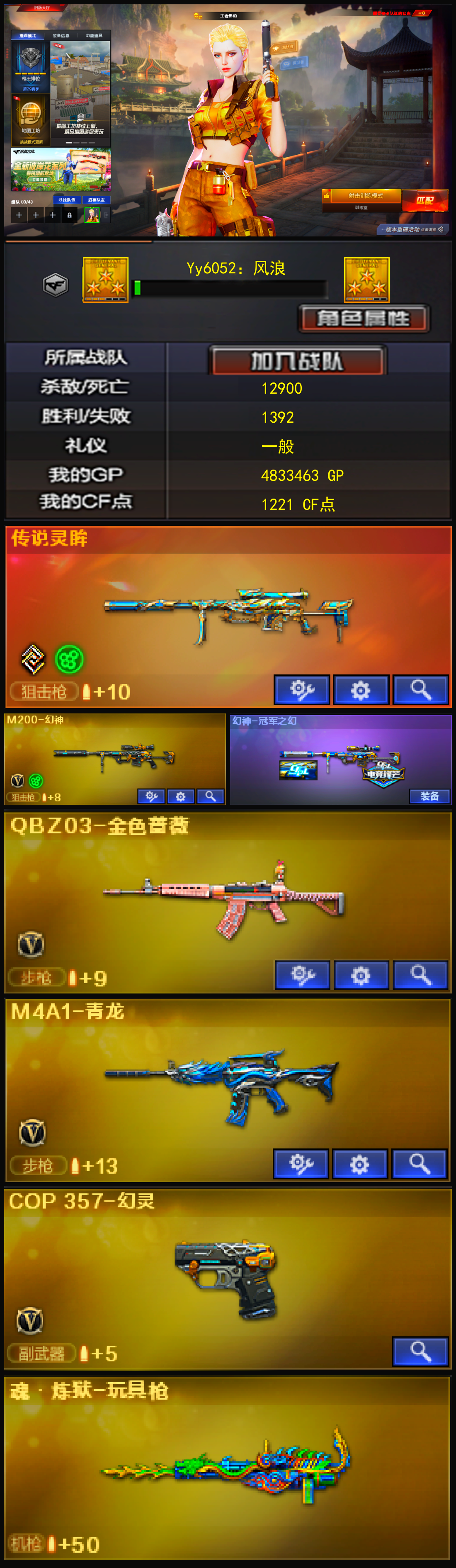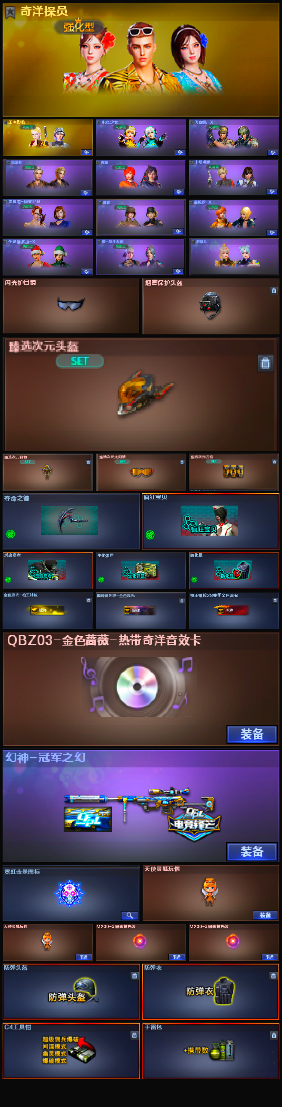 【传说灵眸】【m200幻神+冠军之幻皮肤】【幻灵手雷套】【m4青龙】【qbz金色蔷薇+热带奇洋音效卡】【ak47黑鲨】小人呛【毁灭孙三炮】角色【四防 王者影豹 职业经理】【奇洋探员 电竞少女 紫霞】【奇洋探员海龟背包】