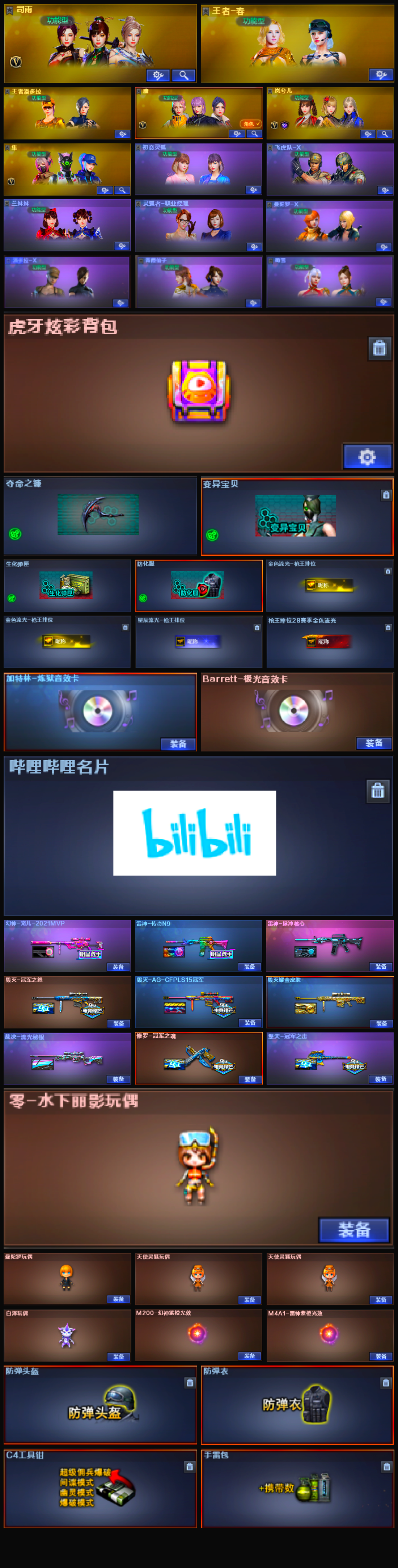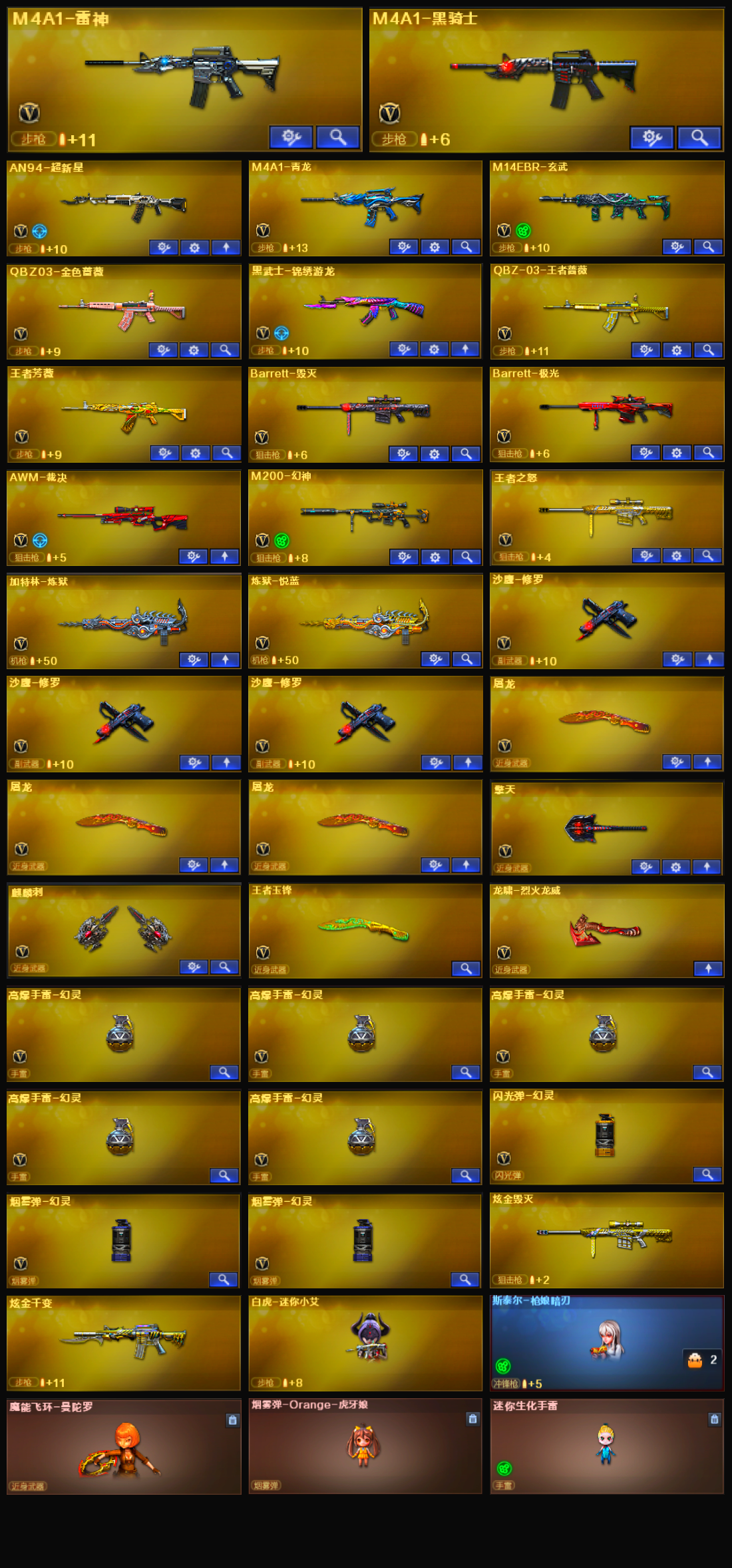 【m200幻神+宠儿皮肤】【qbz金色蔷薇】【m4青龙 m14ebr玄武】【qbz王者蔷薇】【王者芳薇】【极光+音效卡】【炼狱+音效卡】【雷神+n9皮肤】【毁灭+冠军之怒皮肤+ag15焕军皮肤】【修罗*3+冠军之魂皮肤】【擎天+冠军之击皮肤】【麒麟刺+白鲨皮肤】【王者之怒 王者玉锋】【黑骑士 超新星 黑武士锦绣游龙 裁决 炼狱悦蓝】【屠龙*3 龙啸烈火龙威】【白虎迷你小艾】【幻灵手雷套】【四防:王者春 王者潘多拉 职业经理】【角色:司雨 鹰 岚兮儿 隼】【虎牙炫彩背包】