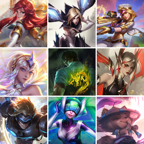 【传说皮肤】黎明使者锐雯 炼狱魔犬内瑟斯 腥红之月鬼武姬阿卡丽 太空律动猫猫布里和里茨 西部天使赛娜 真实伤害艾克 偶像歌手阿狸 驯龙学者黑默丁格 绅士科加斯 上古战魂魔腾 霸天零式赛恩 源计划超体莫德凯撒 至尊魔女莫甘娜 符文战熊沃利贝尔 源计划毁灭派克 神拳李青 铁哥们儿奥拉夫 灵魂莲华瑟提 灵魂莲华锤石 苍穹之光韦鲁斯 最终BOSS维迦 血石领主弗拉基米尔 暗星女王拉克丝 地狱行者孙悟空 红色男爵库奇 暗星锤石 西部魔影大小姐蕾欧娜 星之守护者拉克丝 霸天异形卡兹克 日蚀骑士蕾欧娜 女帝卡特琳娜 枯萎之壤泽拉斯 律政大亨蒙多 神王德莱厄斯 星之守护者卡莎 魔女伊芙琳 恶魔男爵瑞兹 黑夜使者索拉卡 银河魔装机神兰博 灵能特工娑娜 星之守护者金克丝 鬼魂新娘莫甘娜 奥德赛凯隐 冰霜亚龙希瓦娜 陆地王者4WD布里茨 星之守护者阿狸 星之守护者霞 冰川巨兽墨菲特 至高天派克 死亡骑士盖伦 黯黑魔龙希瓦娜 光明哨兵薇恩 幻灵战斗队长厄运小姐 女皇艾希 魔幻卡牌崔斯特 太空律动律动队长提莫 黑夜使者亚索 黎明使者索拉卡 黎明使者永恩 战地机甲厄加特 星之守护者洛 女警狙击凯特琳 烈焰雄心崔丝塔娜 影执事劫 女主播迦娜 苹果机器人布里茨 未来战士凯特琳 青花瓷伊泽瑞尔 合金巨兽努努和威朗普 欧米伽小队幽灵特工 战场女武神凯尔 大天使长米迦勒凯尔 恶魔之刃泰达米尔 神王盖伦 邪鸦魅影乐芙兰 黯晶凤凰艾尼维亚 屠龙勇士潘森 神龙尊者昼日真龙亚索 电玩女神娑娜 耀星女神拉克丝 西部天使艾希 地狱之门卫士加里奥 战斗学院凯特琳 西部魔影卢锡安 绝息圣堂锐雯 源计划净化薇恩 灌篮高手德莱厄斯 战斗学院伊泽瑞尔 日蚀骑士希维尔 宇航员诺提勒斯 月蚀骑士蕾欧娜 泳池派对吉格斯 约德尔国队长提莫 源计划林易 星之守护者阿卡丽 源计划联合艾希 源计划泯灭雷克顿 天煞劫 灵魂莲华阿狸 冰霜之刃艾瑞莉娅 双重冰晶艾尼维亚 金牌主播德莱文 神龙尊者夜月幻龙亚索 暗星尊烬 钢铁军团盖伦 提莫约德尔人的一大步 第三类接触黑默丁格 女校长菲奥娜 钢铁之翼凯尔 光明哨兵格雷福斯 丧尸布兰德 驯龙炮手崔丝塔娜 神龙尊者圣龙李青 战地巨兽科加斯 蔷薇绅士杰斯 焰尾妖狐阿狸
