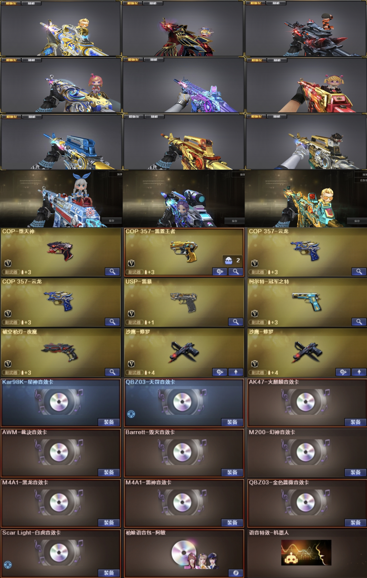 重要武器皮肤:幻神-电流骇客皮肤、幻神-宠儿-2021MVP、幻神-星耀 皮肤、星神-破竹皮肤、毁灭-战神张飞、毁灭-星空、毁灭-荣耀之怒、毁灭耀金皮肤、毁灭-墨兰皮肤、毁灭-星耀 皮肤、毁灭-秦师 皮肤、极光-高能霹雳 皮肤、AWM-天龙-传奇白鲨、裁决-流光秘银、火麒麟-CFSTAR、火麒麟-华夏之心、火麒麟-平天大圣、火麒麟-心动糖果、雷神-化蛇 皮肤、M4A1-干变-孔明皮肤、雷神-源计划2.0专属 皮肤、雷神-刘备 皮肤、雷神-荣耀之魄、雷神-虎将、雷神-脉冲核心、雷神-星空、黑骑士-破界皮肤、黑骑士-伏羲、黑骑士-地狱火、黑骑士-暗月、黑龙-能量核心、幻影-破浪逐光皮肤、金色蔷薇-枪娘阿敏 皮肤、白虎-霓虹机甲皮肤、白虎-虎啸皮肤、天罚-孙权 皮肤、超新星-兔兔战士 皮肤、战神-粉色甜心皮肤、炼狱-电子连击皮肤、炼狱-星空、炼狱-月 皮肤、烈火-熔核皮肤、麒麟刺-月皮肤、屠龙-荣耀之锋、屠龙-星火燎原、龙啸-冠军之啸、黑鲨-电流骇客皮肤、炽芒蝶刃-破浪逐光 皮肤、炽芒蝶刃-荣耀世冠白鲨2023皮肤
