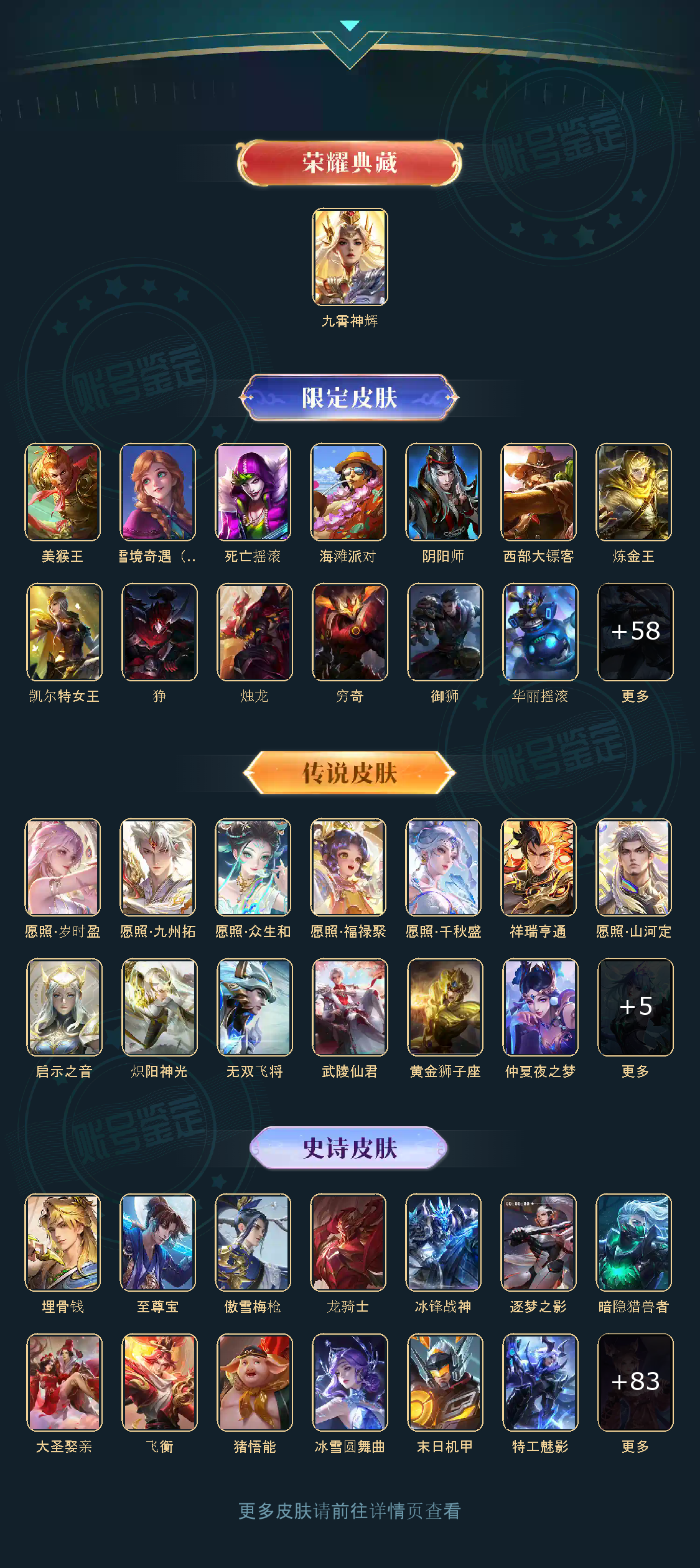 英雄数量121,典藏皮肤数1,皮肤数量298,武陵仙君/黄金狮子座/启示之音