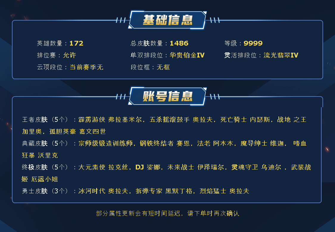 ~~喜欢记得收藏~~可排位~~1197皮全英雄丨836原皮361炫彩丨70神话/至臻/海克斯丨运顶神话莫甘娜丨龙瞎/龙的传人丨神龙尊者套丨灵魂莲华套丨鼠年套丨福牛守护者套丨KDA套丨太空律动套丨哥特萝莉丨幻灵薇恩丨觅心剑姬丨哨兵薇恩丨星守狐狸丨嫦娥皎月丨女帝卡特丨替父从军丨银龙裁决丨青花瓷ez丨FPX李青丨羊年金克斯丨甜心琴女洛丨IG卡莎妖姬丨电玩女警女枪丨海之歌萨勒芬妮丨水晶玫瑰阿克尚丨玉剑男刀剑姬剑圣丨神凰行者萨勒芬妮霞丨EDG男枪佛耶戈厄斐琉斯~~租之前尽量查一下游戏ID,确保段位是您需要的,避免浪费您的时间~~请勿挂机逃跑故意送人头,谢谢合作,谢谢~~