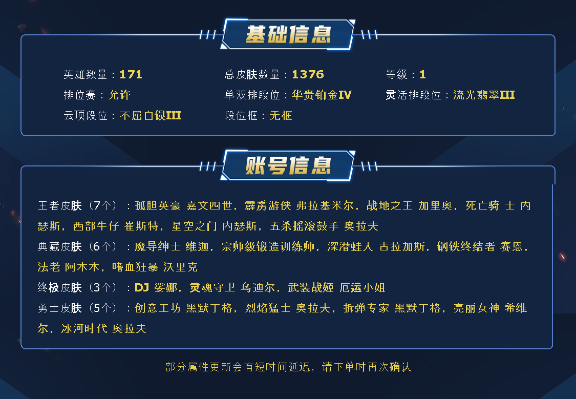 ~~喜欢记得收藏~~可排位~~1400皮全英雄~~租之前尽量查一下游戏ID,确保段位是您需要的,避免浪费您的时间~~请勿挂机逃跑故意送人头,谢谢合作,谢谢~~