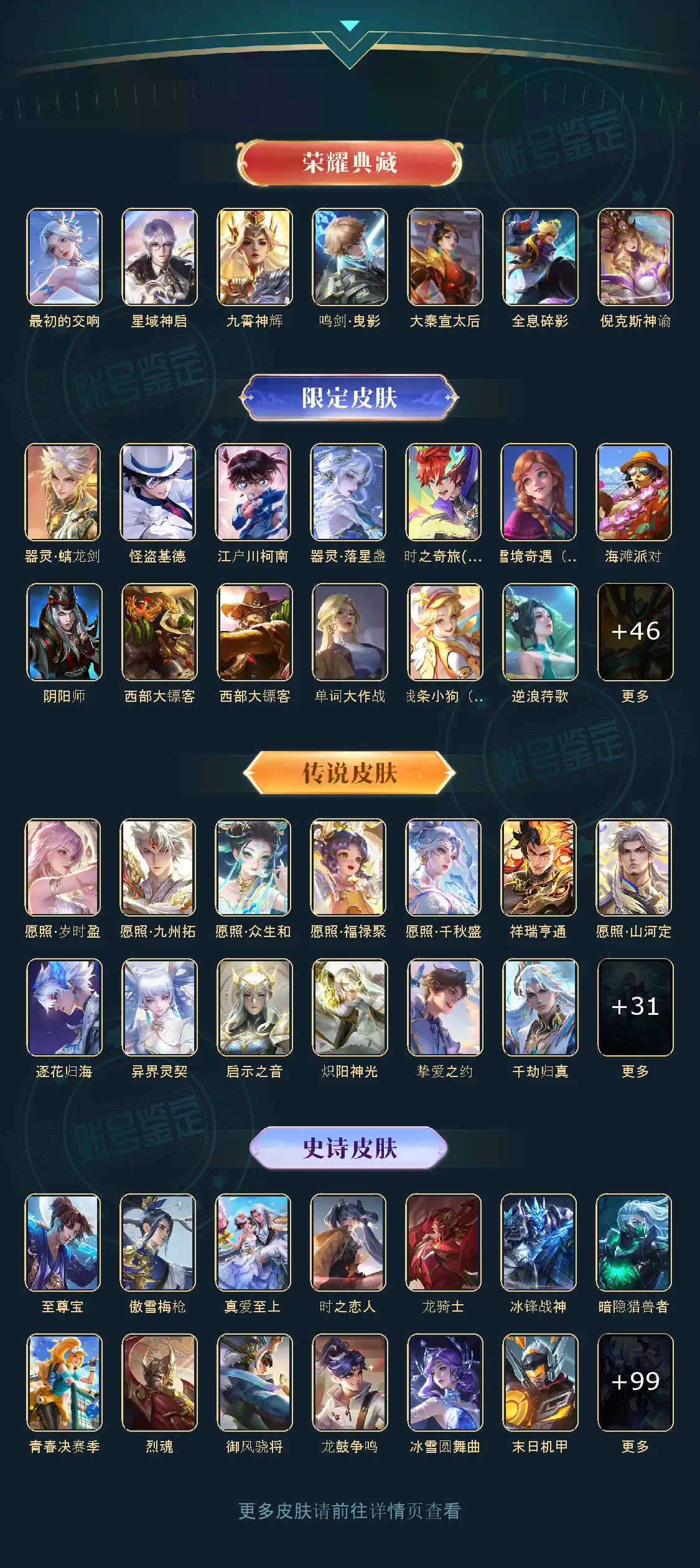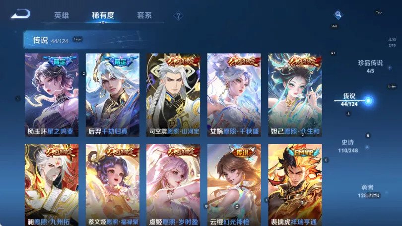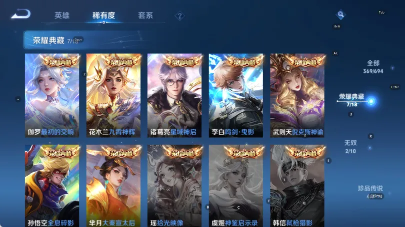 贵族等级V10,英雄数量124,典藏皮肤数7,皮肤数量369,大秦宣太后/全息碎影/倪克斯神谕/鸣剑·曳影/星域神启