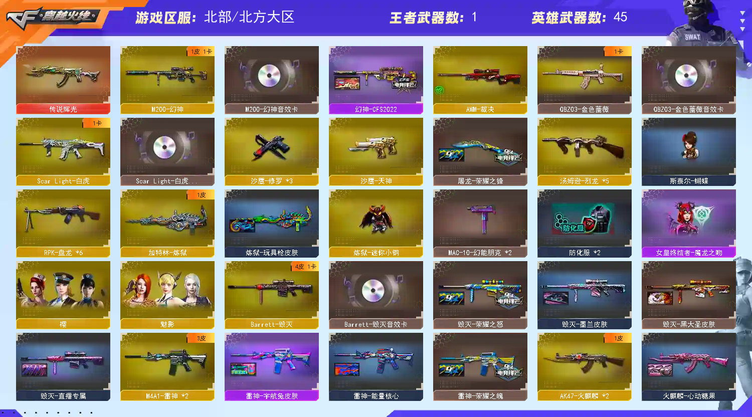 【幻神三件套+白虎三件套】】【m200幻神+m200幻神音效卡+cfs2022皮肤】【传说辉光】【白虎+白虎音效卡+电玩粉兔皮肤】【qbz03金色蔷薇+qbz03金色蔷薇】【6烈龙+6盘龙+炼狱+炼狱迷你小钢+斯泰尔蝴蝶】【毁灭+毁灭音效卡+荣耀之怒皮肤+直播专属皮肤】【雷神+荣耀之魄皮肤】【黑骑士+黑骑士音效卡】【火麒麟 黑龙 雷神 黑骑士 雷神 战神 猩红传说 白虎电玩蓝兔 毁灭 裁决 暗月传说】【炫金千变 炫金武士 炫金天龙 炫金修罗】——【沙鹰修罗*3 沙鹰天神】——【屠龙*3+荣耀之锋皮肤 擎天 幻灵之锋】——【幻灵投掷套装】——【角色】【4防灵狐者职业经理】【魅影】【樱】【女主播】