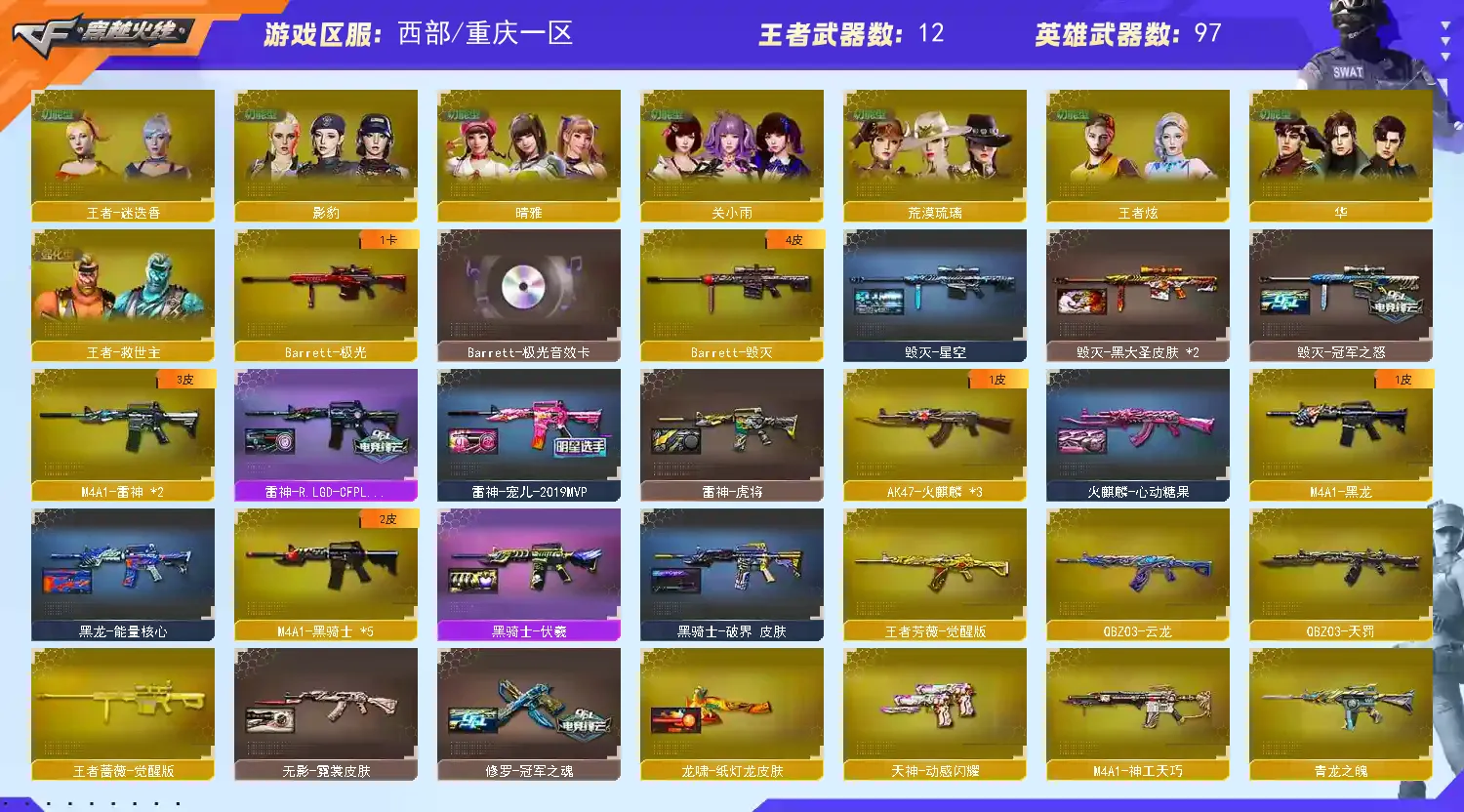【双传说+m200幻神双皮肤+星神三件套!!!】【白虎三件套!!!】【qbz03金色蔷薇三件套!!!】【m200幻神+纸灯笼皮肤+电流骇客皮肤+传说破晓+usp神工天巧+炽芒蝶刃】【98k星神+98k星神音效卡+破竹皮肤】【传说梦魇】【白虎+白虎热带奇洋音效卡+虎啸皮肤】【qbz03云龙套装】【神工天巧套装】【幻灵套装】【qbz03金色蔷薇+qbz03金色蔷薇音效卡+荣耀世冠白鲨皮肤+呛娘阿敏皮肤+qbz03天罚+qbz03天罚音效卡】【5黑骑士+3炼狱+炼狱迷你小钢+烈龙云海游龙】【g36c幻影】【vsk94金蚀】【雷神+lgds18冠军皮肤+宠儿皮肤】【毁灭+呛娘格雷姐妹+s15冠军皮肤+冠军之怒皮肤】【青龙之魄 王者芳薇 王者风武 王者火魄 王者炎心 王者蔷薇 王者凰鸣 凤吟之魄】【王者之影】【极光+极光音效卡】【黑鲨 火麒麟 机械迷城 无影 黑龙 猎神 海王 玄武 超新星 超新星热带奇洋 黑武士锦绣游龙 裁决】——【热门武器/小人呛】【朱雀蛇隐宗 天龙曼陀罗*2 炼狱迷你小钢 cop白鲨 芭蕾特零水下丽影 金色小号】——【传说破晓 usp神工天巧 cop幻灵*2 cop云龙 荣耀世冠柯尔特 天神*6 修罗*3】——【炽芒蝶刃 幻灵之锋 龙啸 龙啸烈火龙威 龙啸热带奇洋 麒麟刺 擎天 屠龙 云龙扇 唐刀神工天巧】——【幻灵投掷物套装 神工天巧投掷物套装*4 云龙投掷物套装 王者之魄投掷物套装】——【角色】【4防王者炫 4防职业经理】【关小雨 荒漠琉璃 晴雅 影豹 雨墨】【华】【王者迷迭香】【奇洋探员 乔伊教练 王者救世主 云海玲珑】